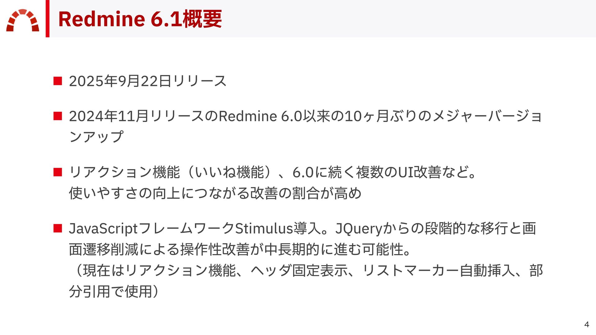 2024年11 月 リリースのRedmine 6.0以来の10ヶ 月 ぶりのメジャーバージョ ンアップ ▪ リアクション機能(いいね機能)、6.0に続く複数のUI改善など。 使いやすさの向上につながる改善の割合が 高 め ▪ JavaScriptフレームワークStimulus導 入 。JQueryからの段階的な移 行 と画 面 遷移削減による操作性改善が中 長 期的に進む可能性。 (現在はリアクション機能、ヘッダ固定表 示 、リストマーカー 自 動挿 入 、部 分引 用 で使 用 )