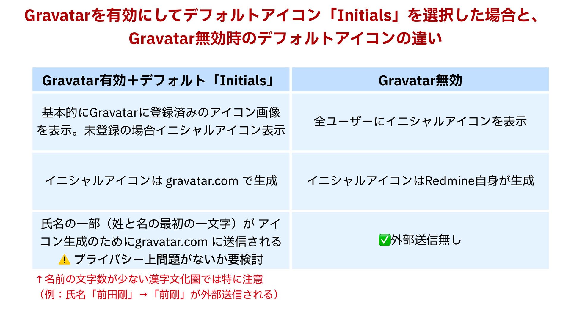 示 イニシャルアイコンは gravatar.com で 生 成 イニシャルアイコンはRedmine 自身 が 生 成 氏 名の 一 部(姓と名の最初の 一文 字)が アイ コン 生 成のためにgravatar.com に送信される ⚠ プライバシー上問題がないか要検討 ✅外部送信無し ↑名前の 文 字数が少ない漢字 文 化圏では特に注意 (例: 氏 名「前 田 剛」→「前剛」が外部送信される)