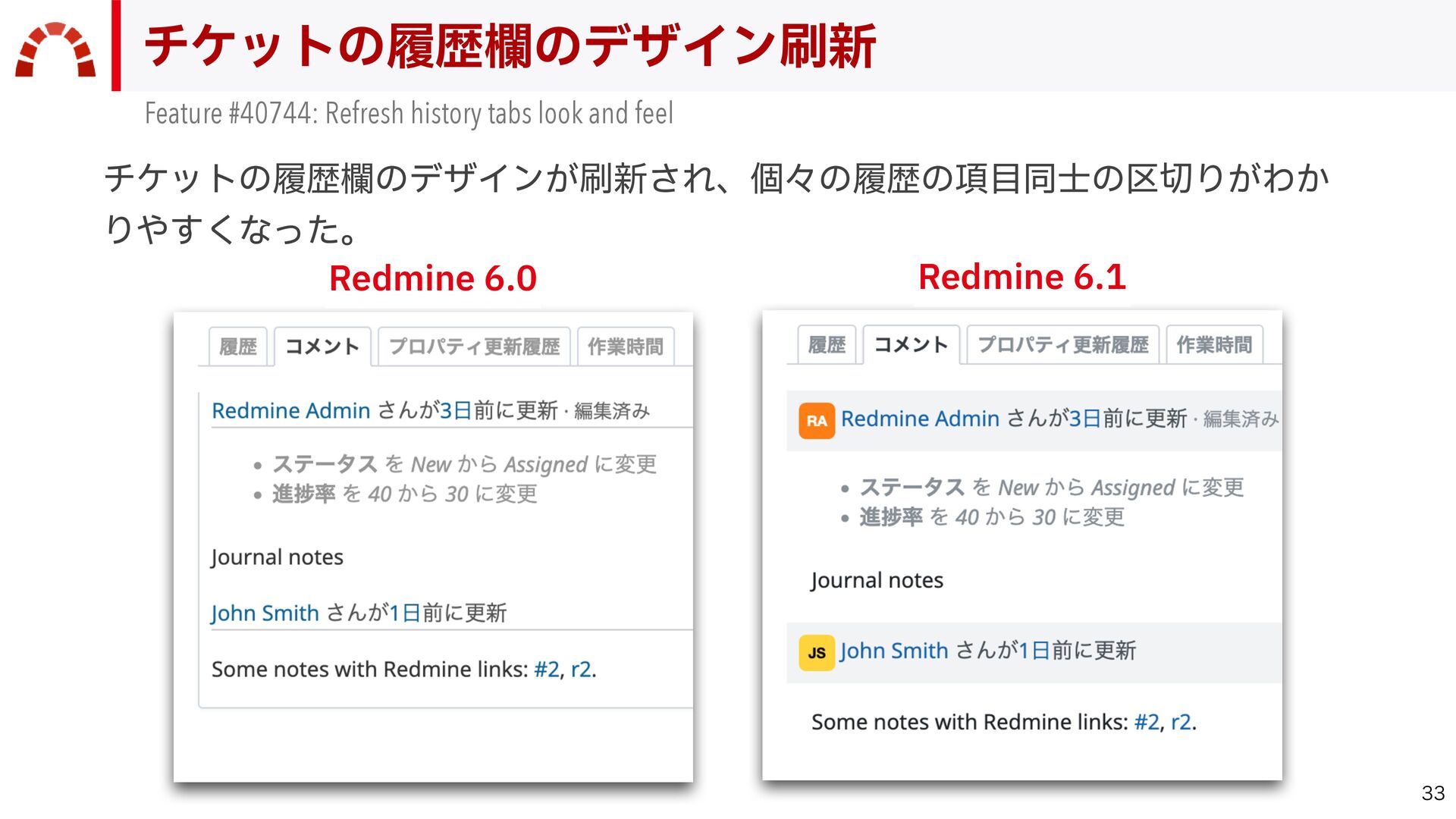 チケットの履歴欄のデザインが刷新され、個々の履歴の項 目 同 士 の区切りがわか りやすくなった。 Redmine 6.1 Redmine 6.0