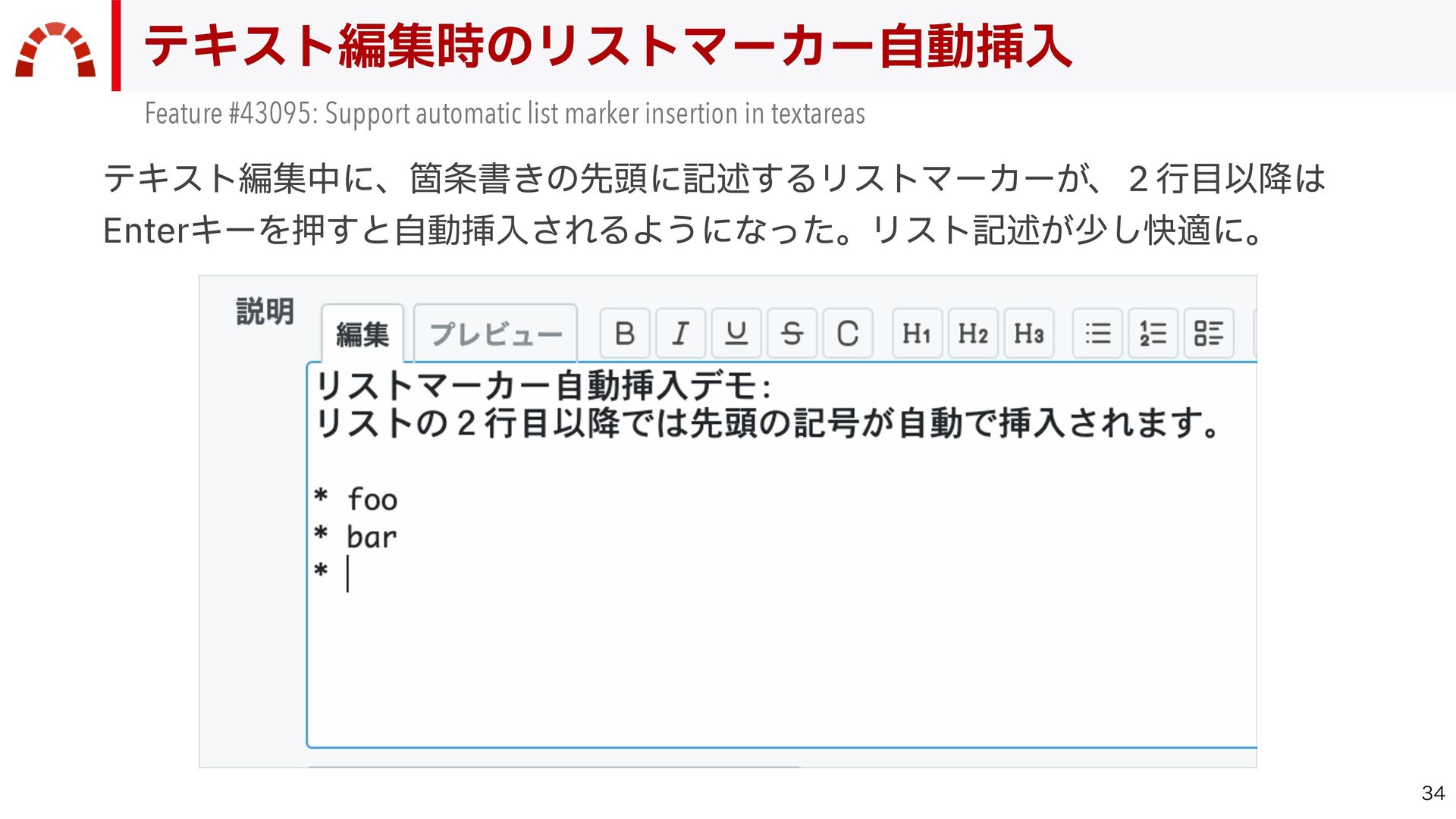 marker insertion in textareas テキスト編集中に、箇条書きの先頭に記述するリストマーカーが、2 行目 以降は Enterキーを押すと 自 動挿 入 されるようになった。リスト記述が少し快適に。