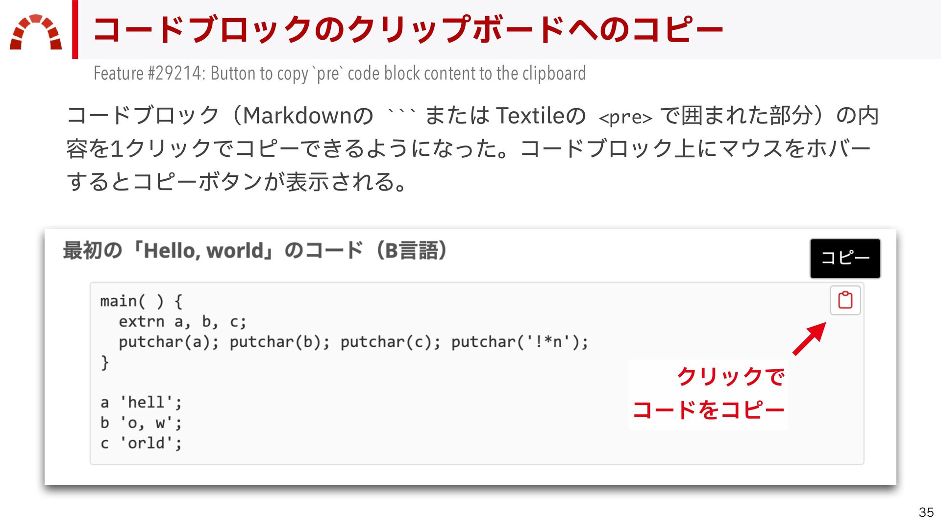 示 される。 Feature #29214: Button to copy `pre` code block content to the clipboard クリックで コードをコピー