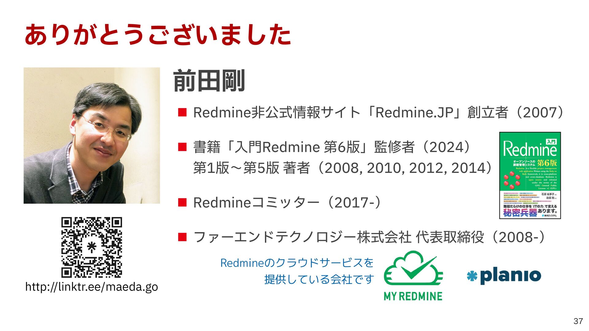 第6版」監修者(2024) 第1版〜第5版 著者(2008, 2010, 2012, 2014) ▪ Redmineコミッター(2017-) ▪ ファーエンドテクノロジー株式会社 代表取締役(2008-) http://linktr.ee/maeda.go ありがとうございました 前 田 剛 Redmineのクラウドサービスを 提供している会社です