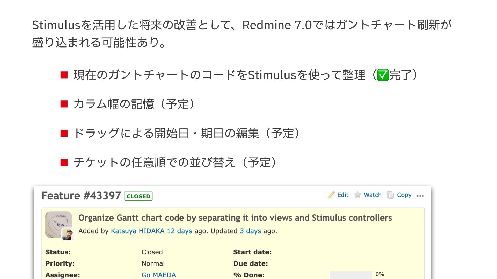 Stimulusを活 用 した将来の改善として、Redmine 7.0ではガントチャート刷新が 盛り込まれる可能性あり。 ▪ 現在のガントチャートのコードをStimulusを使って整理(✅完了) ▪ カラム幅の記憶(予定) ▪