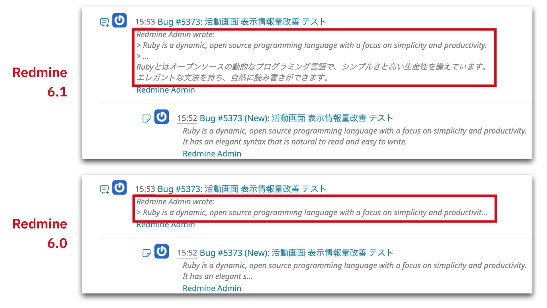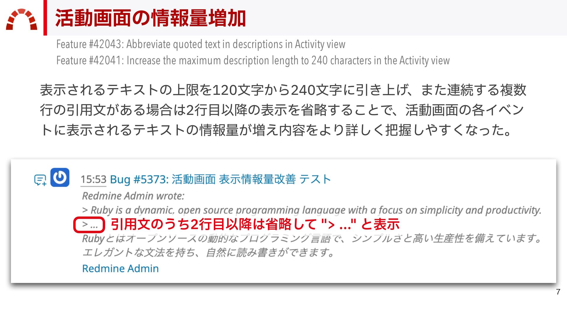 字に引き上げ、また連続する複数 行 の引 用文 がある場合は2 行目 以降の表 示 を省略することで、活動画 面 の各イベン トに表 示 されるテキストの情報量が増え内容をより詳しく把握しやすくなった。 引 用文 のうち2 行目 以降は省略して "> ..." と表 示 Feature #42043: Abbreviate quoted text in descriptions in Activity view Feature #42041: Increase the maximum description length to 240 characters in the Activity view
