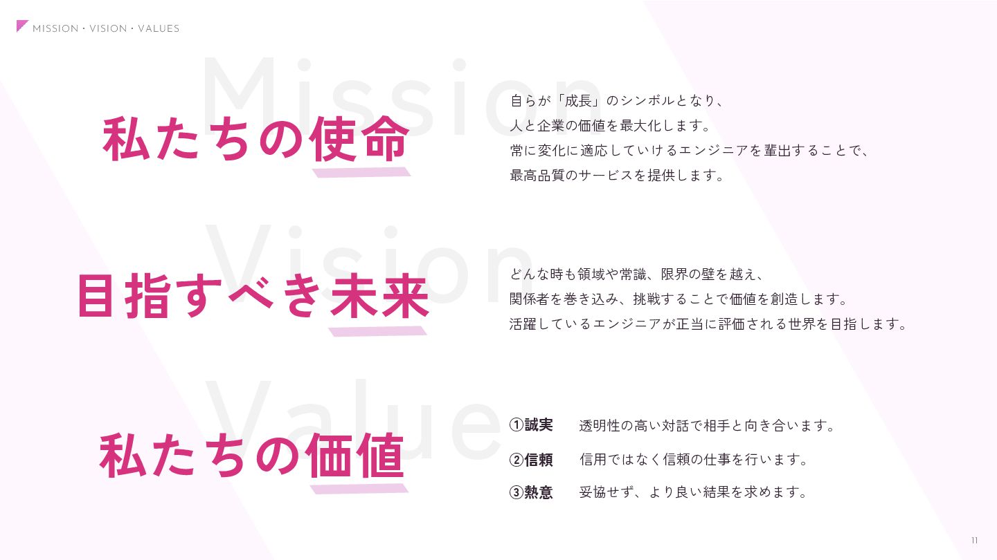 関係者を巻き込み、挑戦することで価値を創造します。 活躍しているエンジニアが正当に評価される世界を目指します。 目指すべき未来 Value 私たちの価値 透明性の高い対話で相手と向き合います。 ①誠実 信用ではなく信頼の仕事を行います。 ②信頼 妥協せず、より良い結果を求めます。 ③熱意
