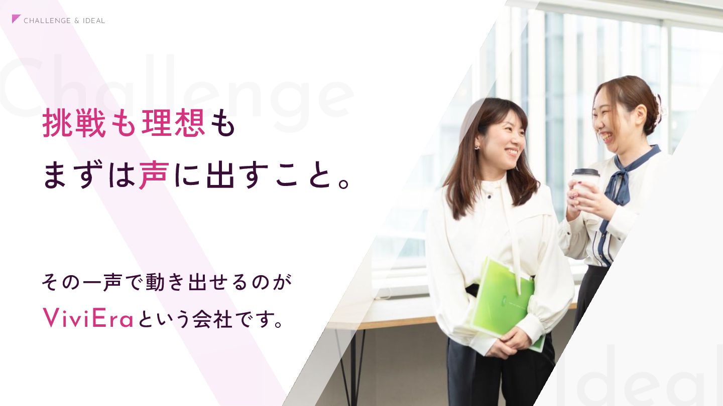 CHALLENGE & IDEAL その一声で動き出せるのが ViviEraという会社です。 挑戦も理想も まずは声に出すこと。