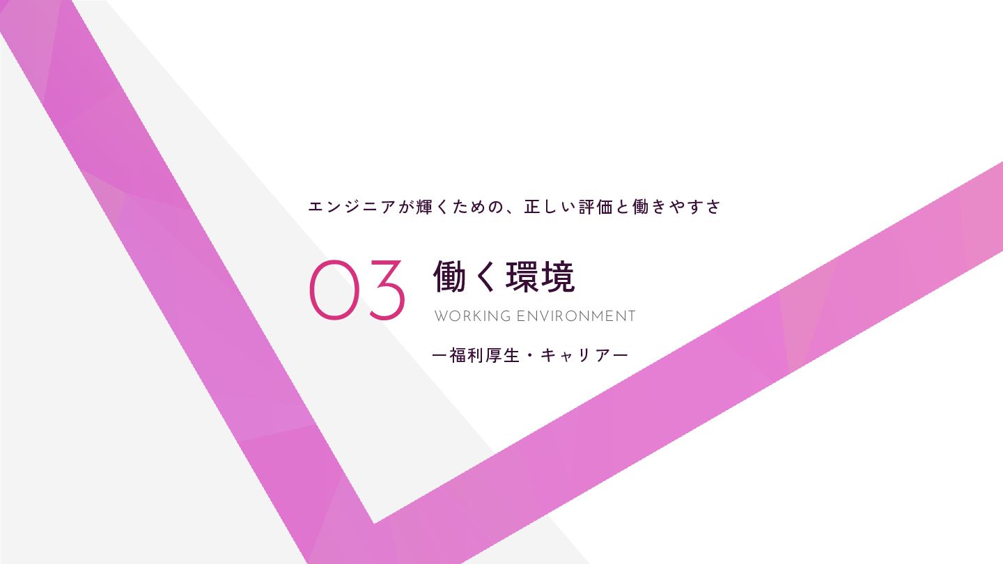 03 働く環境 WORKING ENVIRONMENT エンジニアが輝くための、正しい評価と働きやすさ ー福利厚生・キャリアー