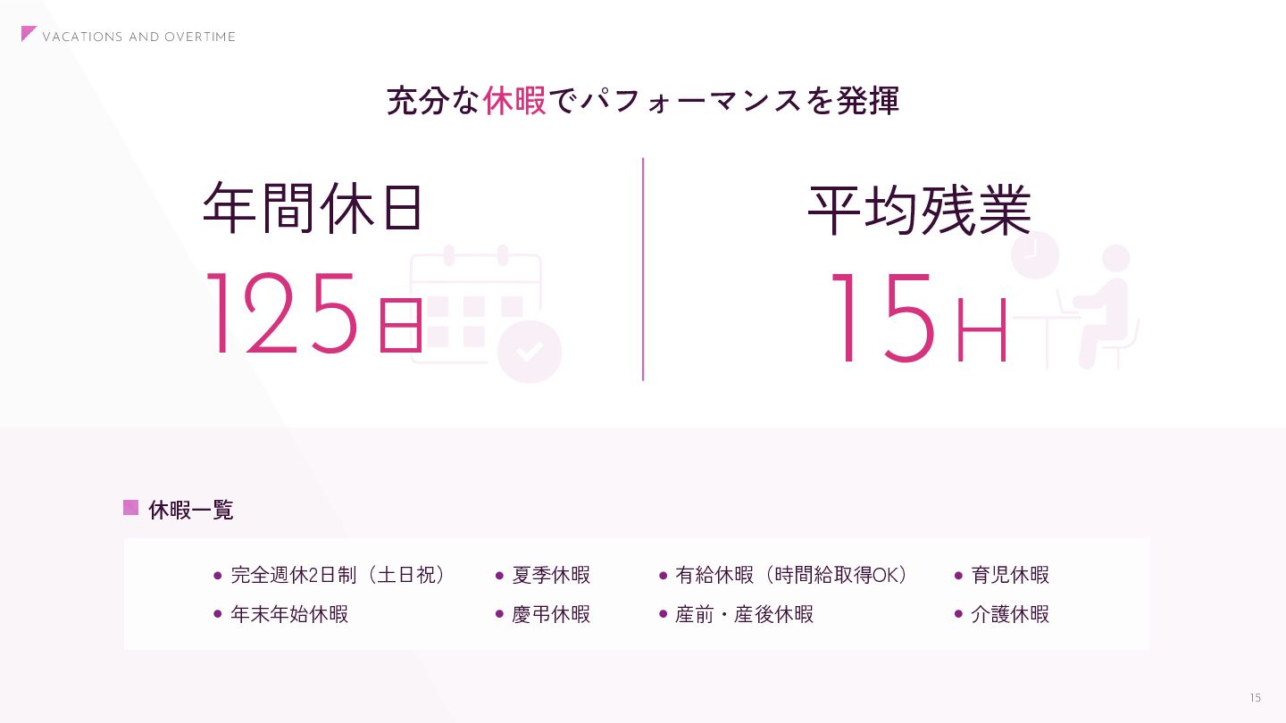 VACATIONS AND OVERTIME 充分な休暇でパフォーマンスを発揮 年間休日 125日 15 平均残業 15H 休暇一覧