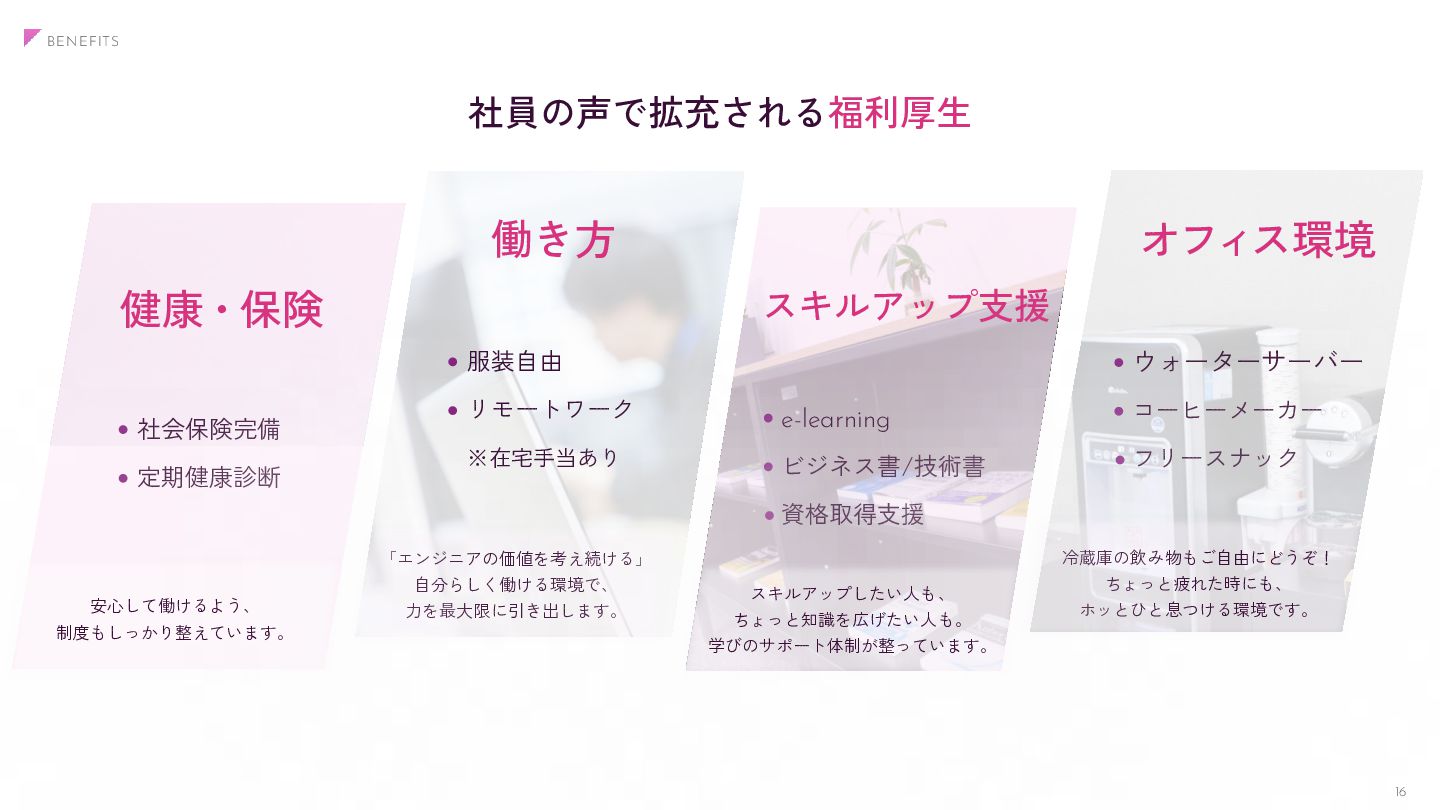 社員の声で拡充される福利厚生 社会保険完備 定期健康診断 健康・保険 16 BENEFITS オフィス環境 働き方 スキルアップ支援 e-learning