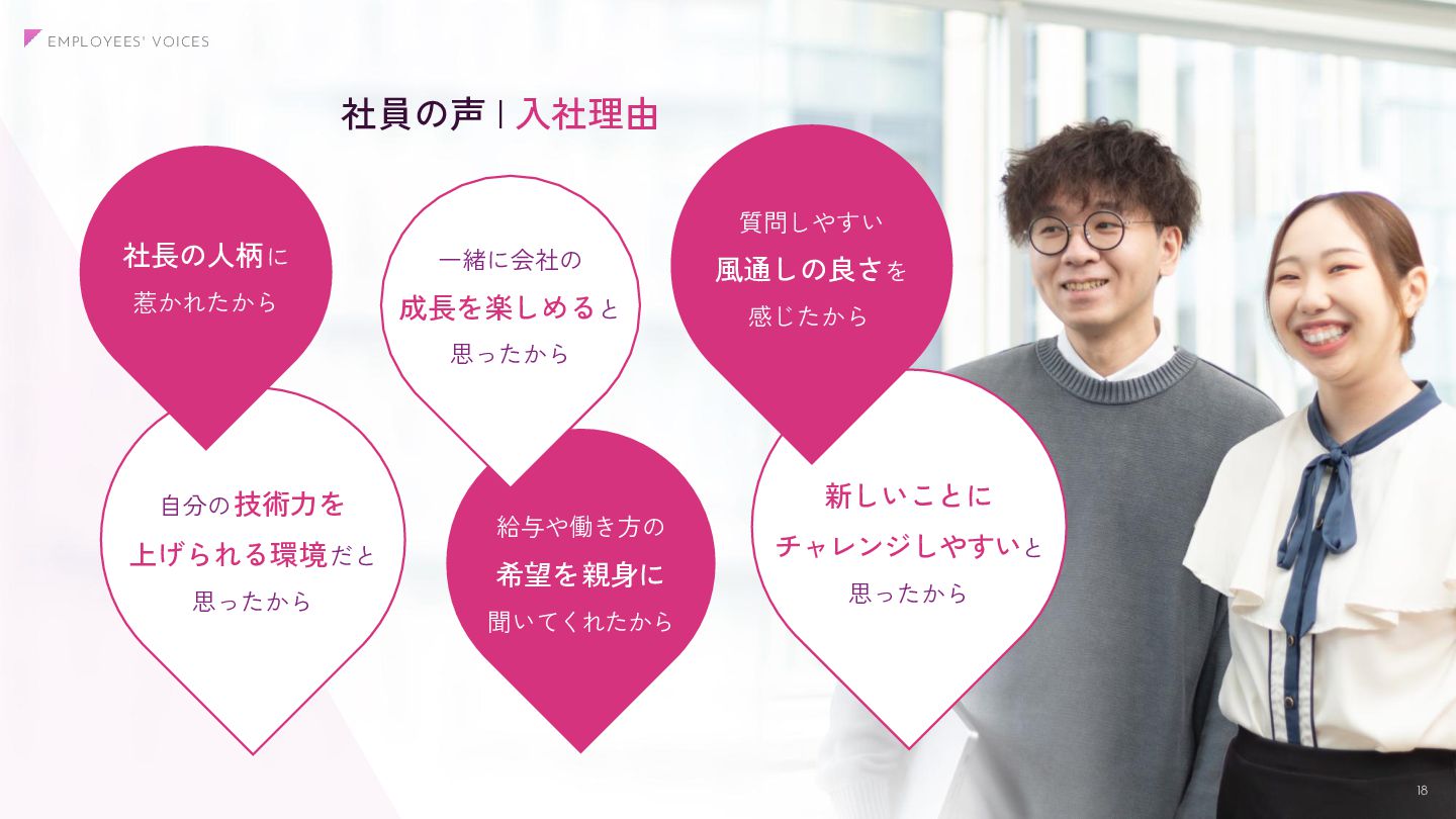 聞いてくれたから 一緒に会社の 成長を楽しめると 思ったから 新しいことに チャレンジしやすいと 思ったから 質問しやすい 風通しの良さを 感じたから 社員の声 | 入社理由