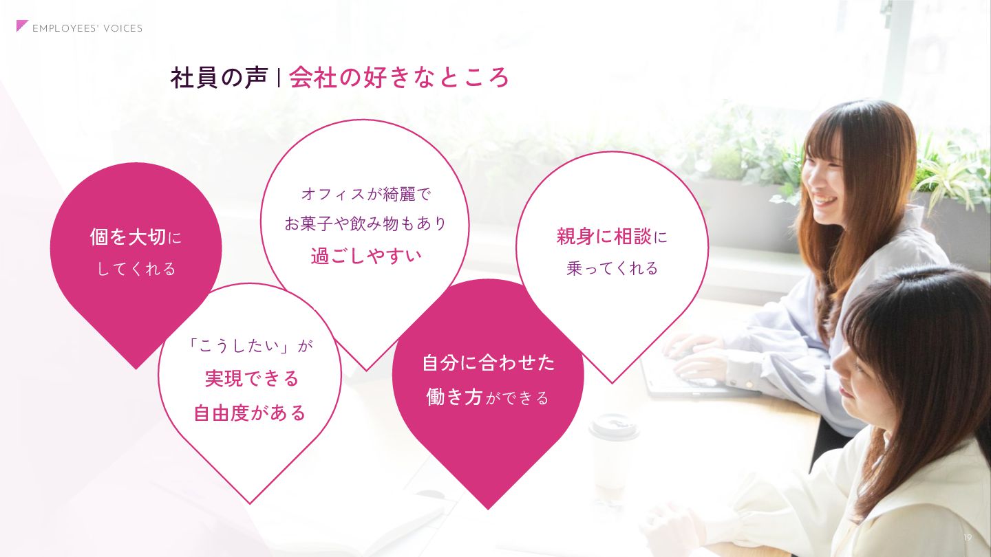 自分に合わせた 働き方ができる EMPLOYEES' VOICES 19 社員の声 | 会社の好きなところ オフィスが綺麗で お菓子や飲み物もあり