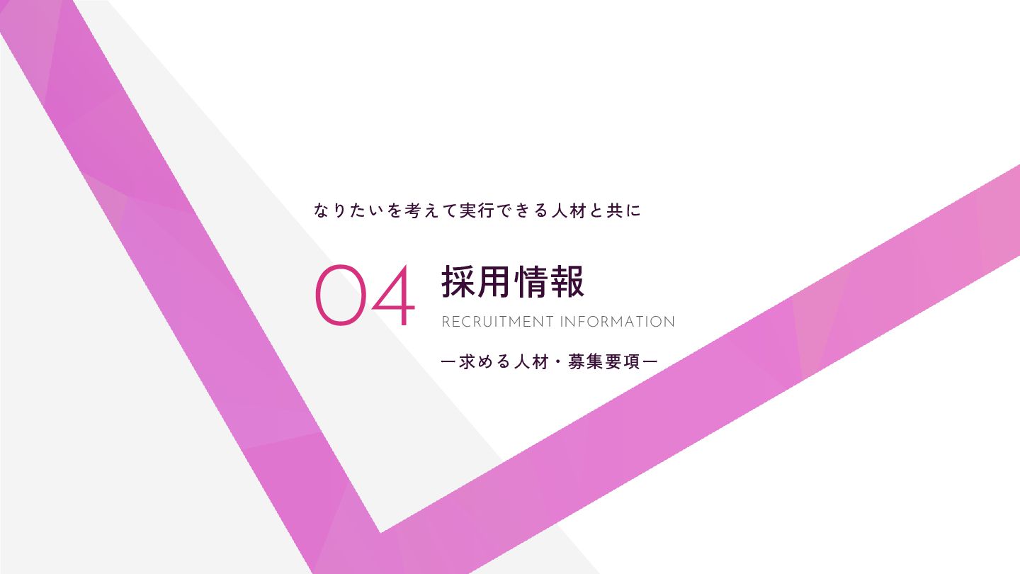 04 採用情報 RECRUITMENT INFORMATION なりたいを考えて実行できる人材と共に ー求める人材・募集要項ー