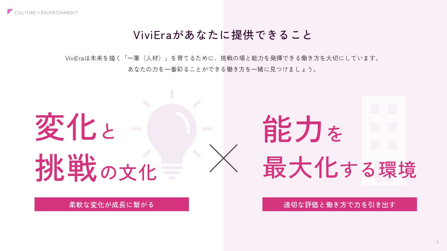 CULTURE×ENVIRONMENT ViviEraは未来を描く「一筆(人材)」を育てるために、挑戦の場と能力を発揮できる働き方を大切にしています。 あなたの力を一番彩ることができる働き方を一緒に見つけましょう。 柔軟な変化が成長に繋がる 適切な評価と働き方で力を引き出す 変化と 挑戦の文化 能力を 最大化する環境 ViviEraがあなたに提供できること