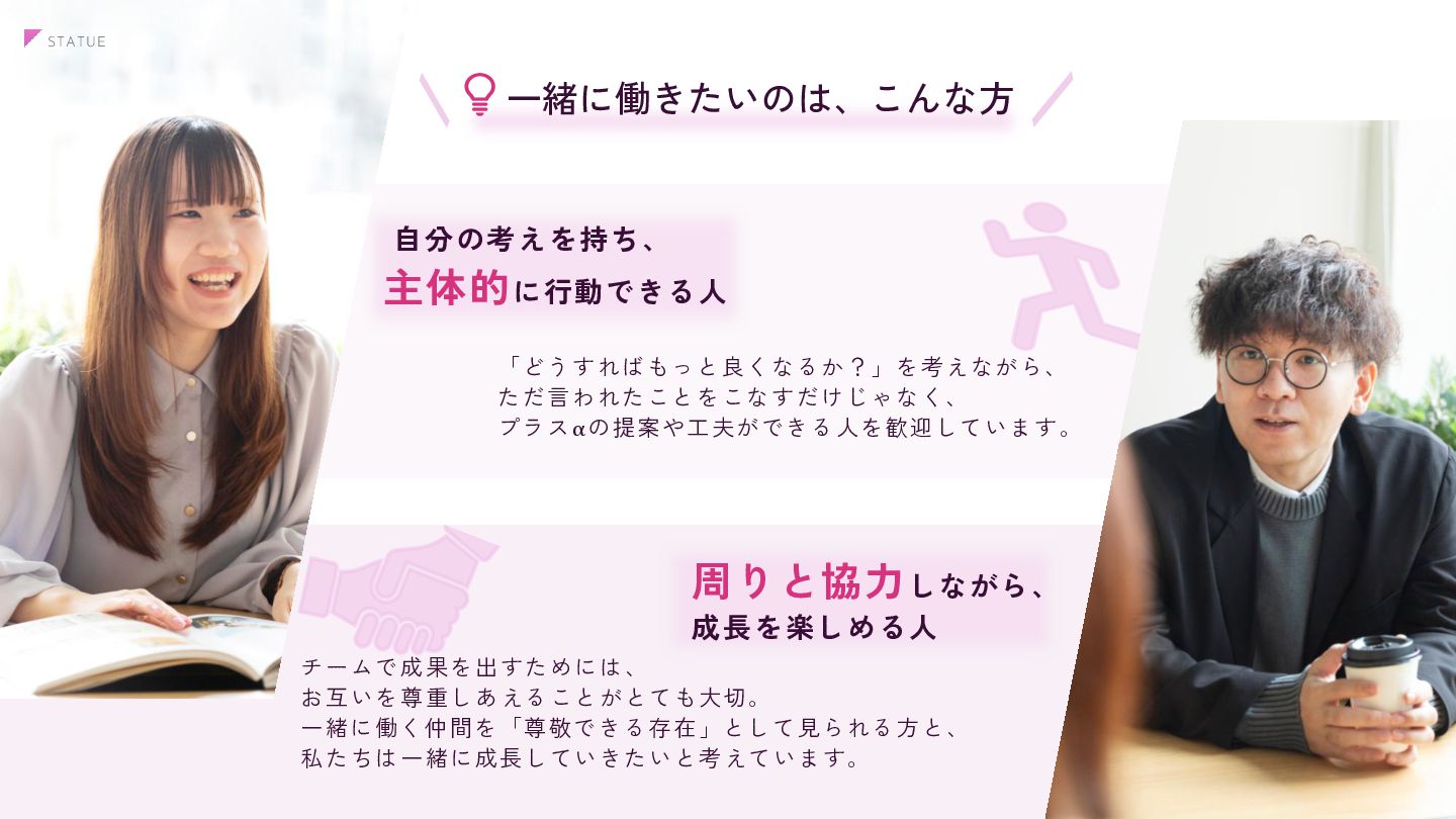 STATUE 21 一緒に働きたいのは、こんな方 「どうすればもっと良くなるか?」を考えながら、 ただ言われたことをこなすだけじゃなく、 プラスαの提案や工夫ができる人を歓迎しています。 自分の考えを持ち、 主体的に行動できる人 周りと協力しながら、 成長を楽しめる人