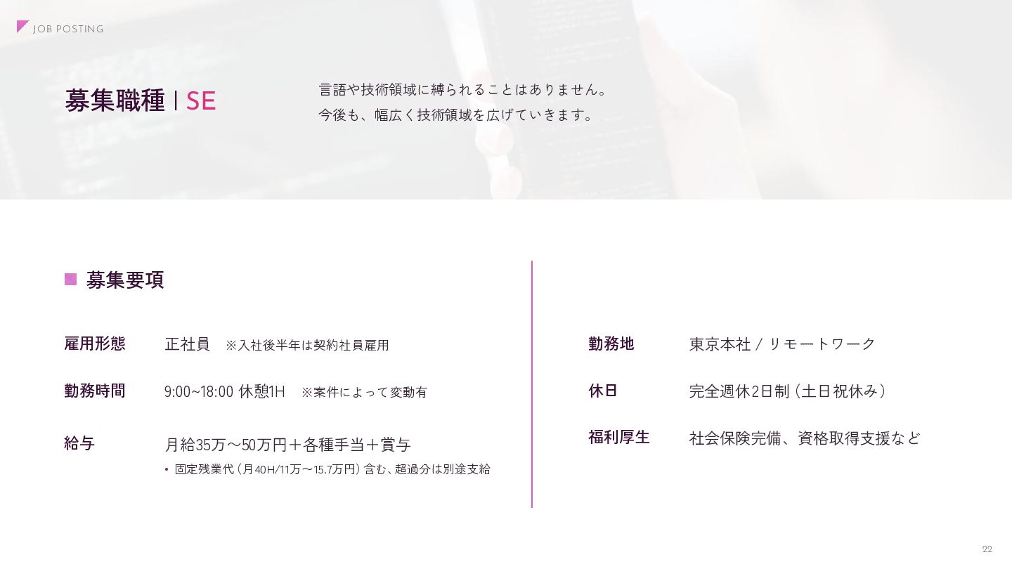 JOB POSTING 22 募集職種 | SE 言語や技術領域に縛られることはありません。 今後も、幅広く技術領域を広げていきます。 雇用形態 正社員