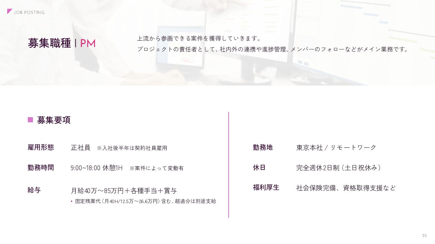 JOB POSTING 23 募集職種 | PM 上流から参画できる案件を獲得していきます。 プロジェクトの責任者として、 社内外の連携や進捗管理、 メンバーのフォローなどがメイン業務です。