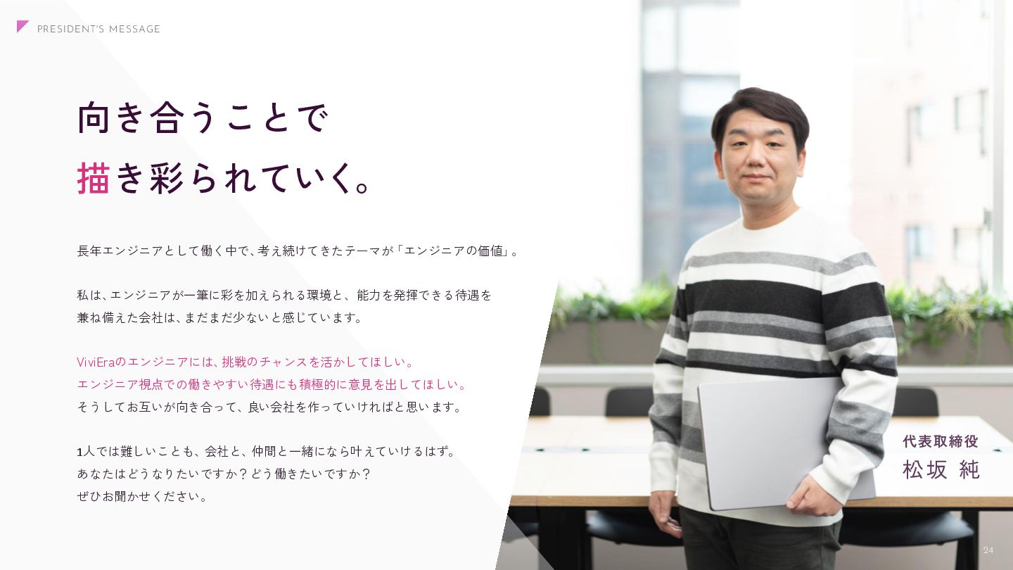 ViviEraのエンジニアには、 挑戦のチャンスを活かしてほしい。 エンジニア視点での働きやすい待遇にも積極的に意見を出してほしい。 そうしてお互いが向き合って、良い会社を作っていければと思います。 1人では難しいことも、会社と、仲間と一緒になら叶えていけるはず。 あなたはどうなりたいですか?どう働きたいですか? ぜひお聞かせください。 PRESIDENT'S MESSAGE
