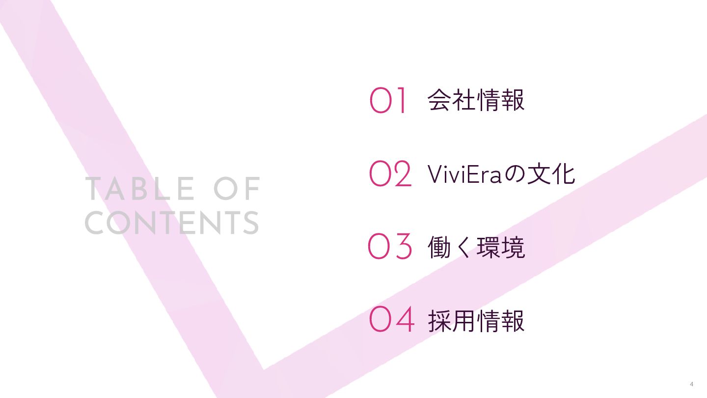 4 会社情報 ViviEraの文化 働く環境 採用情報 01 03 02 04
