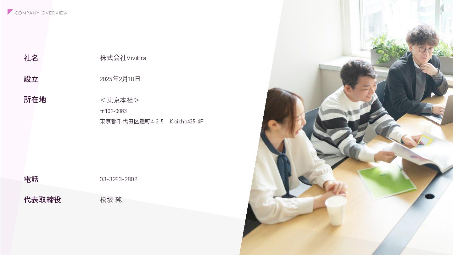 6 COMPANY OVERVIEW 社名 株式会社ViviEra 設立 2025年2月18日 所在地 <東京本社> 〒102-0083
