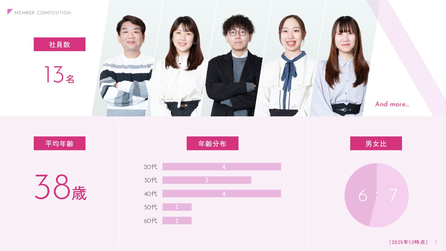 3 4 1 1 20代 30代 40代 50代 60代 年齢分布 6 7 : 男女比 (2025年12時点)