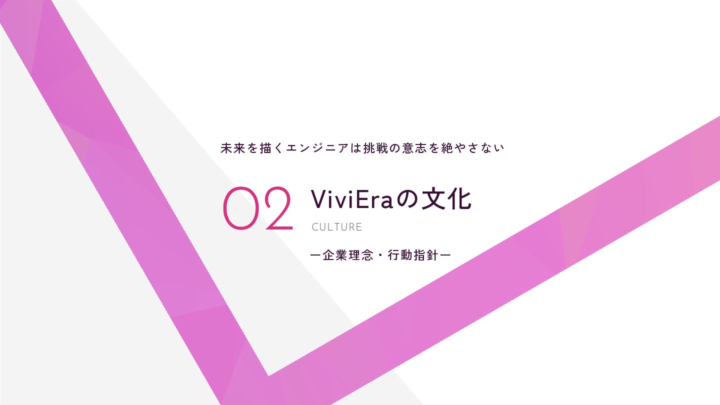 02 ViviEraの文化 CULTURE 未来を描くエンジニアは挑戦の意志を絶やさない ー企業理念・行動指針ー