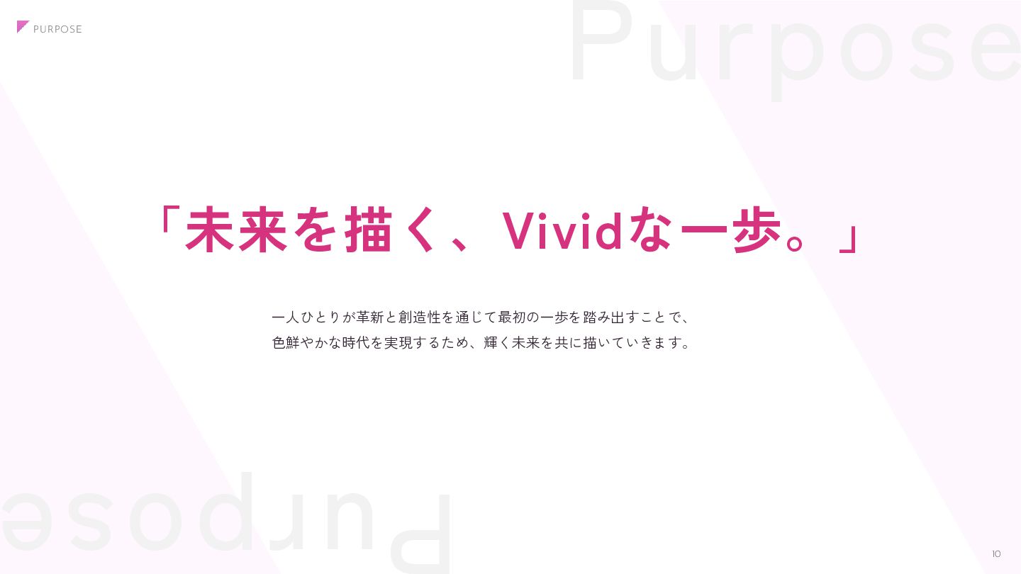 PURPOSE 10 一人ひとりが革新と創造性を通じて最初の一歩を踏み出すことで、 色鮮やかな時代を実現するため、輝く未来を共に描いていきます。 Purpose Purpos 「未来を描く、Vividな一歩。」