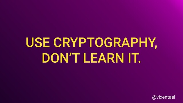 We talked about securing data, and about mistakes developers make when they are trying to use encryption. And what they actually want from cryptography: they want high level functions, they want easy to use instruments that just works. They want boring crypto. But in a real world we have different levels of paranoia: from Faraday cage to hardware and software solutions. We named three layers of software solutions: boxed, crypto-systems and crypto-libs. And how to select which one to use. And about Edisson lamp as an example of boring, but working system.