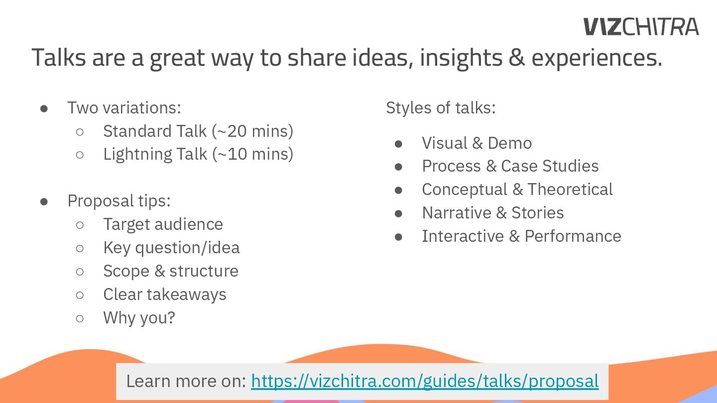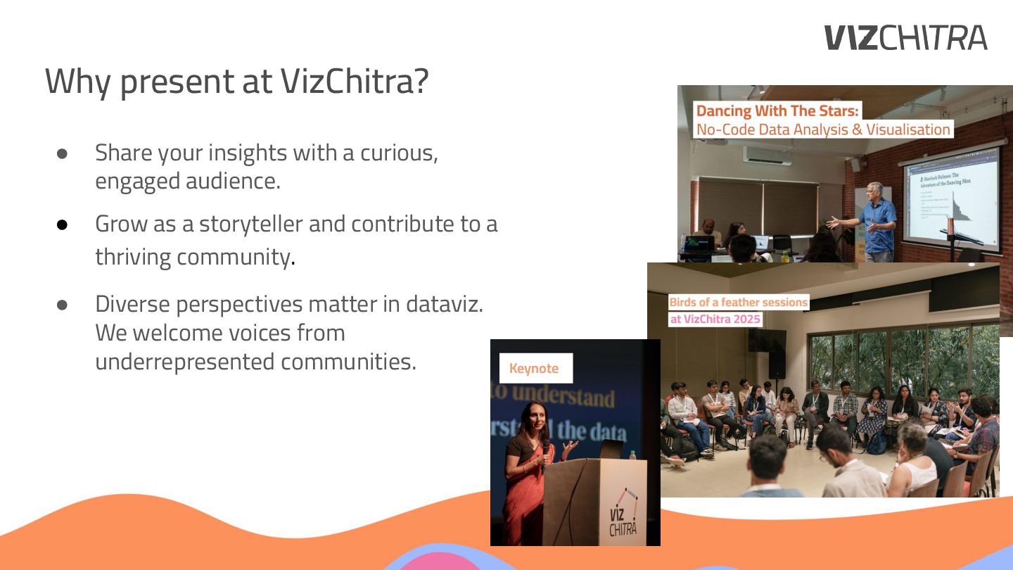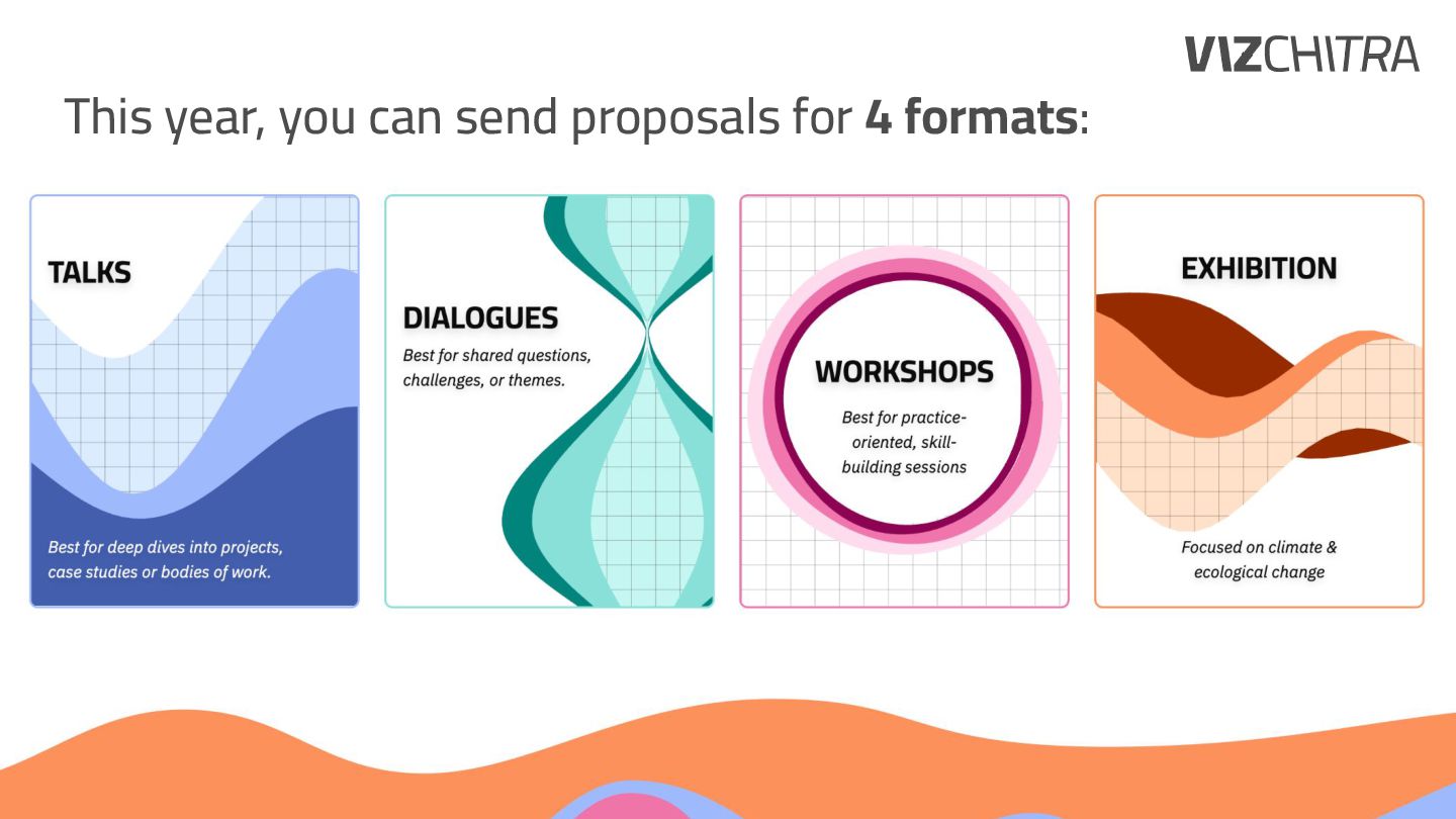 Our annual conference - VizChitra 2026 is set to take place on July 03–04, 2026 in Bangalore . The Call for Proposals and Call for Exhibition is open until February 15th, 2026. We’re looking for talks, workshops, dialogues (facilitated discussions) & exhibition (data art installations) proposals. To help everyone craft a strong proposal and make a submission, or address any queries around submissions, we hosted a Proposal Jam on 31st Jan. You can watch the video on Youtube