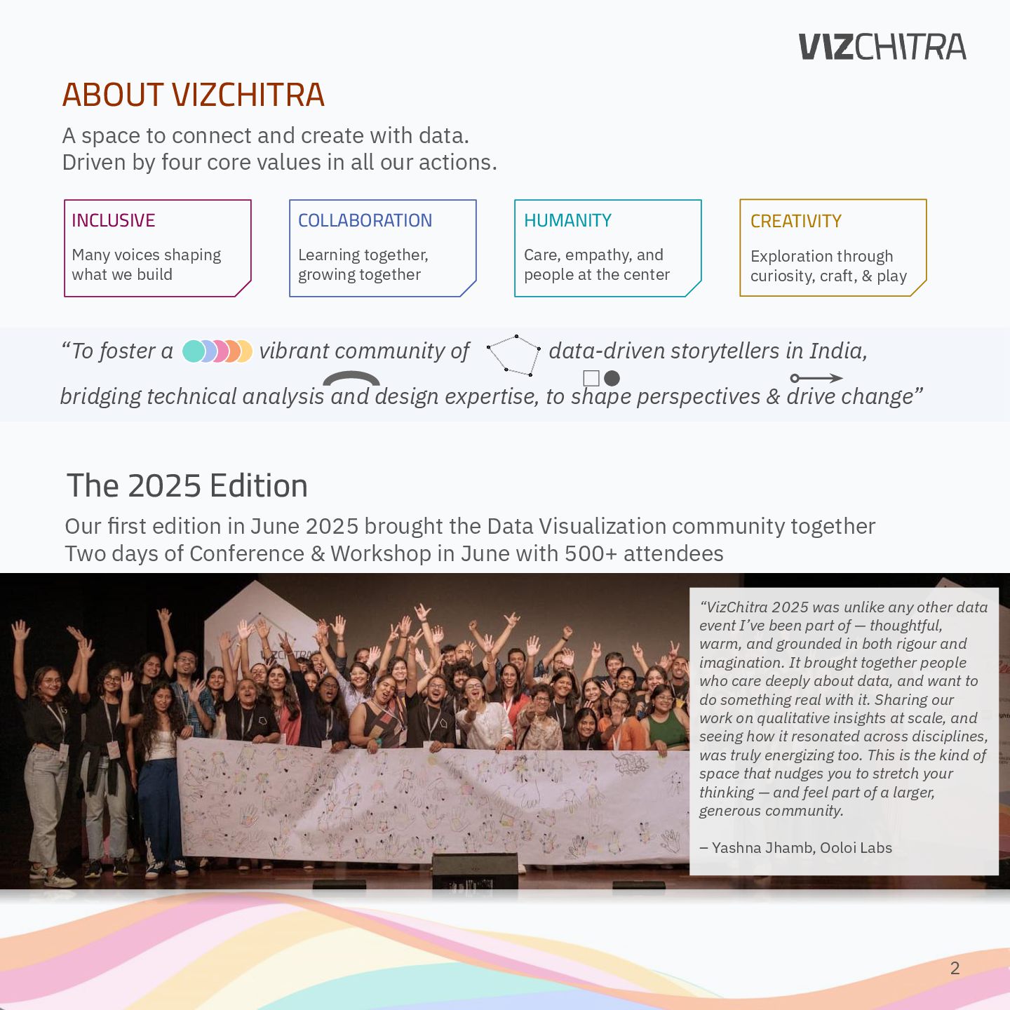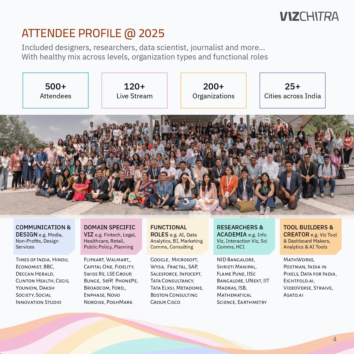 Google, Microsoft, Wysa, Fractal, SAP, Salesforce, Infocept, Tata Consultancy, Tata Elxsi, Metadome, Boston Consulting Group, Cisco RESEARCHERS & ACADEMIA e.g. Info Viz, Interaction Viz, Sci Comms, HCI
