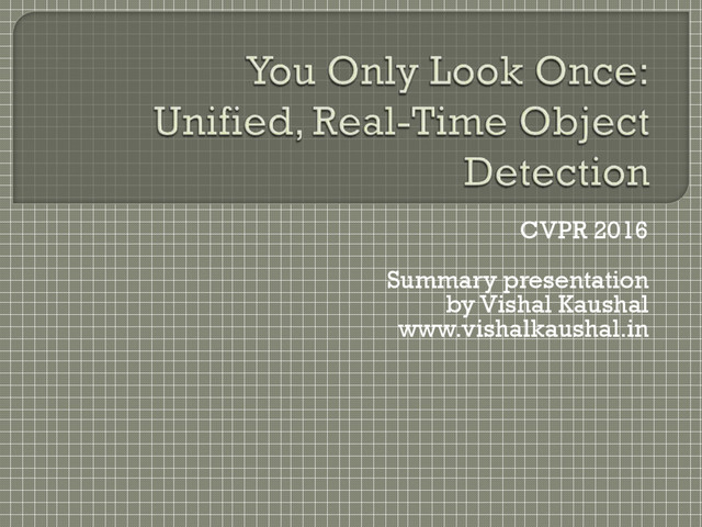 bounding boxes which are responsible for prediction (i.e. maximum overlap with ground truth box) • Highest weightage, hence multiplied by λcoord = 5 3rd term • Classification error of those bounding boxes which are responsible for prediction • Medium weightage, hence multiplied by 1 4th term • Classification error of those boxes which are NOT responsible for prediction • Least weightage, hence multiplied by λobj = 0.5 5th term • Penalizes classification error if an object is present in that grid cell • Hence the notion of conditional class probability