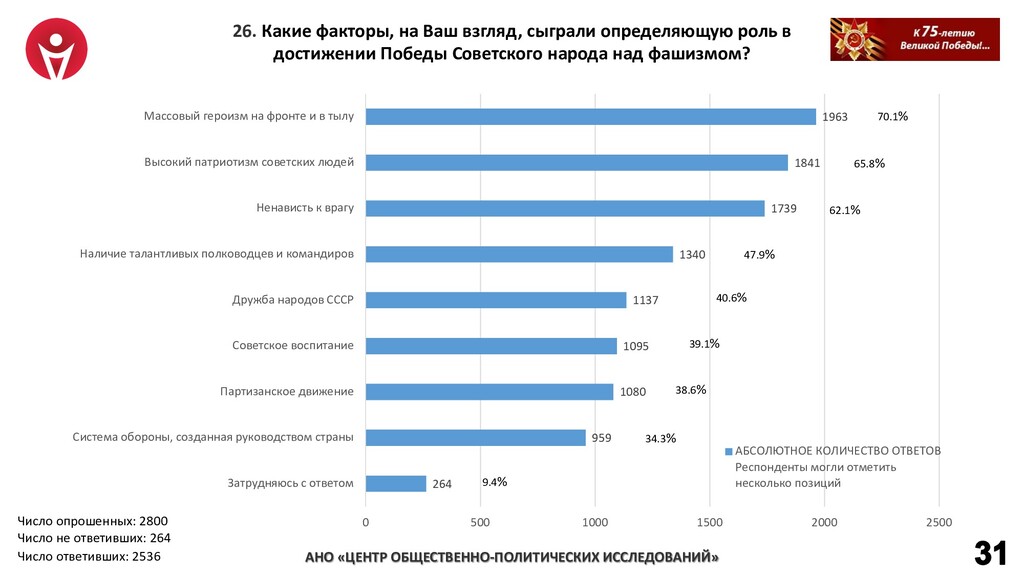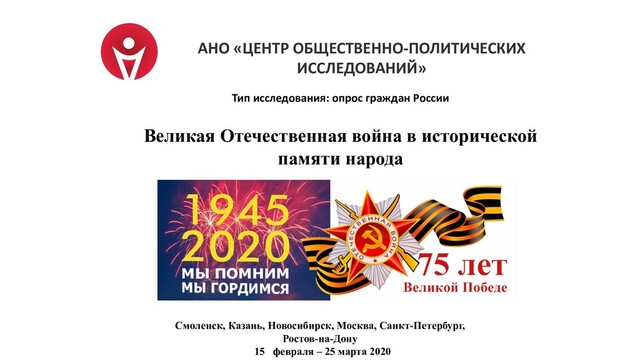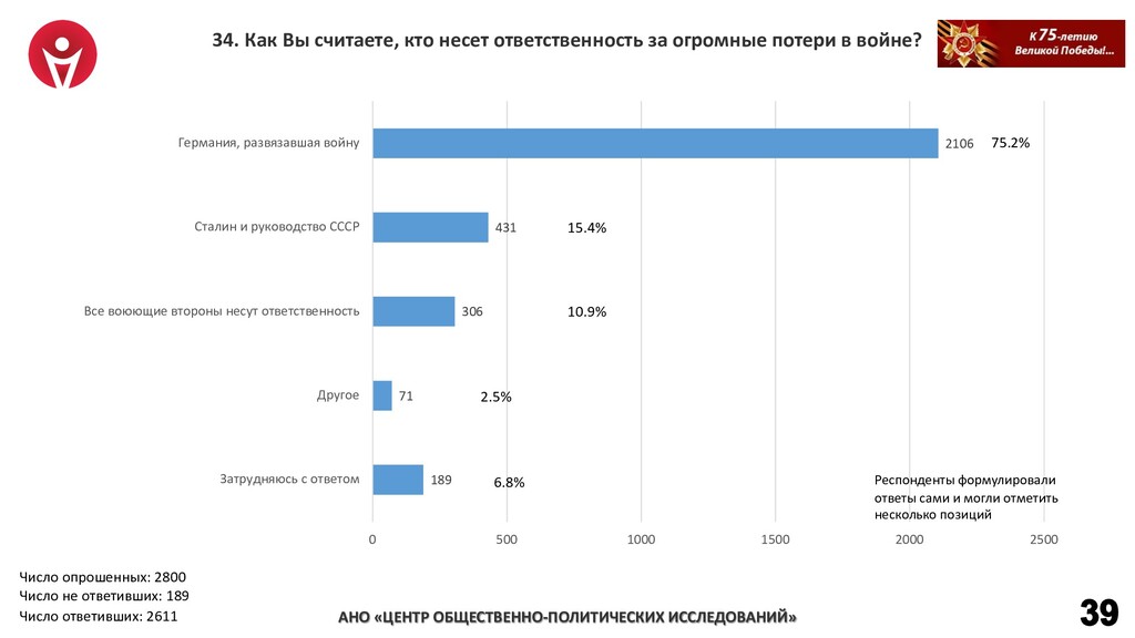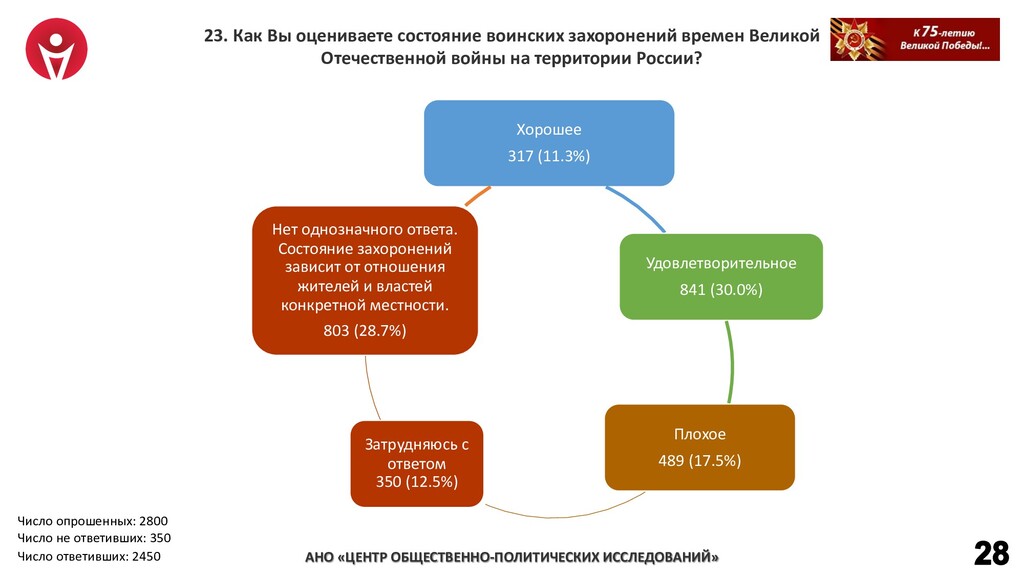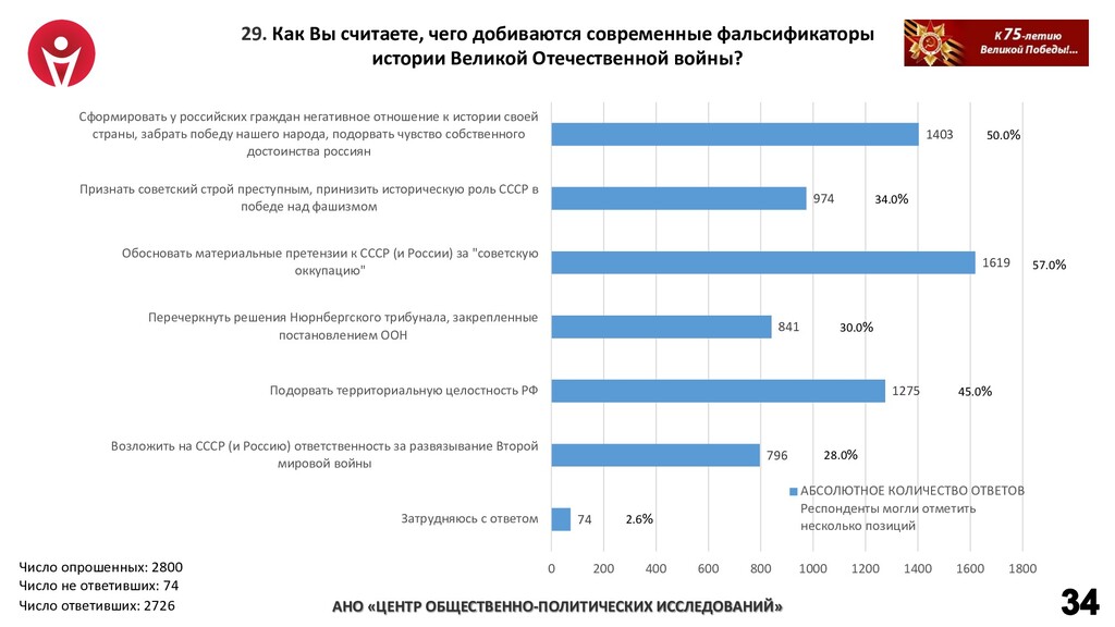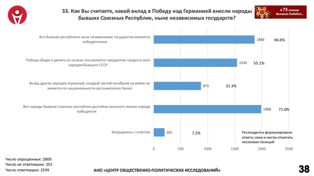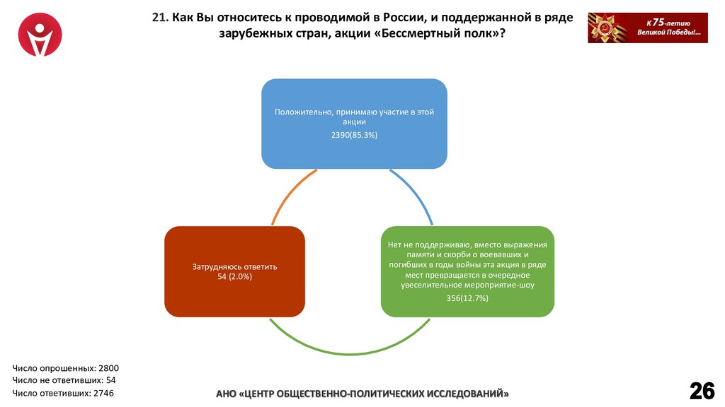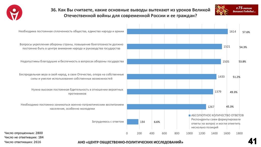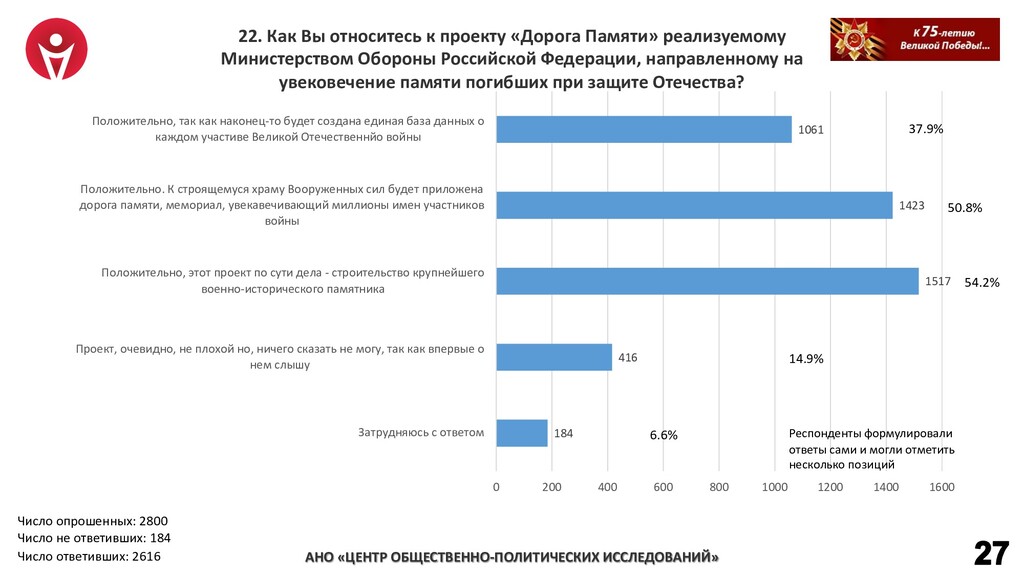 Обороны Российской Федерации, направленному на увековечение памяти погибших при защите Отечества? АНО «ЦЕНТР ОБЩЕСТВЕННО-ПОЛИТИЧЕСКИХ ИССЛЕДОВАНИЙ» Число опрошенных: 2800 Число не ответивших: 184 Число ответивших: 2616 184 416 1517 1423 1061 0 200 400 600 800 1000 1200 1400 1600 Затрудняюсь с ответом Проект, очевидно, не плохой но, ничего сказать не могу, так как впервые о нем слышу Положительно, этот проект по сути дела - строительство крупнейшего военно-исторического памятника Положительно. К строящемуся храму Вооруженных сил будет приложена дорога памяти, мемориал, увекавечивающий миллионы имен участников войны Положительно, так как наконец-то будет создана единая база данных о каждом участиве Великой Отечественнйо войны 37.9% 50.8% 54.2% 14.9% 6.6% Респонденты формулировали ответы сами и могли отметить несколько позиций