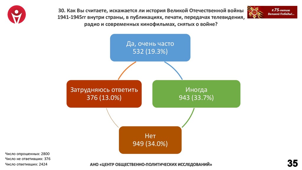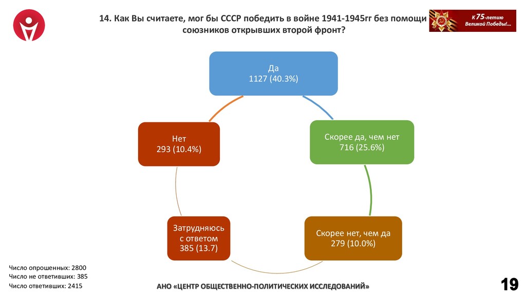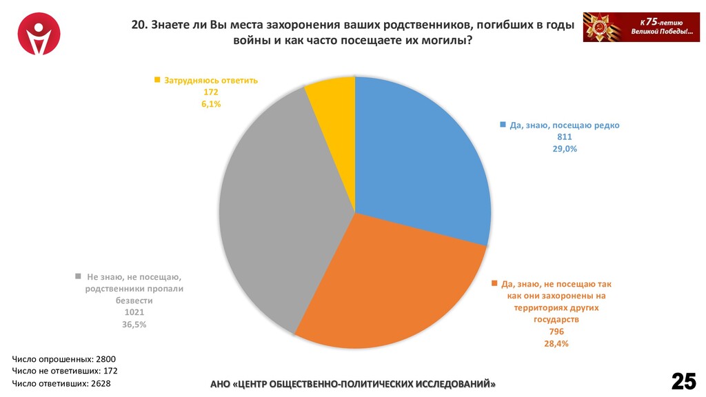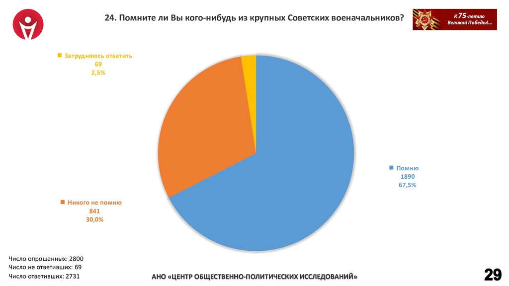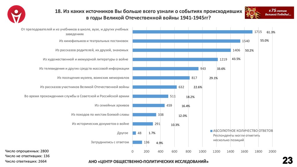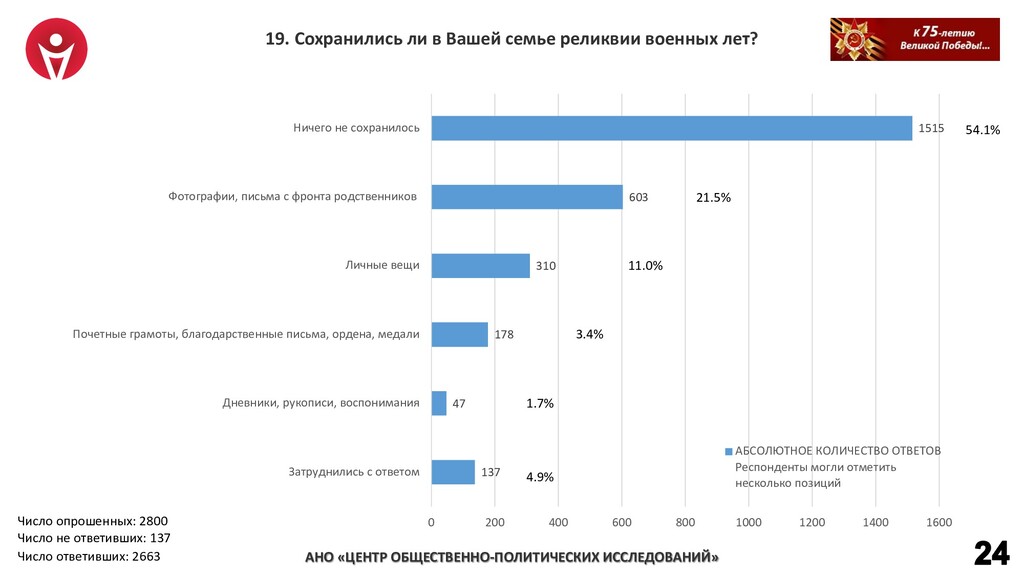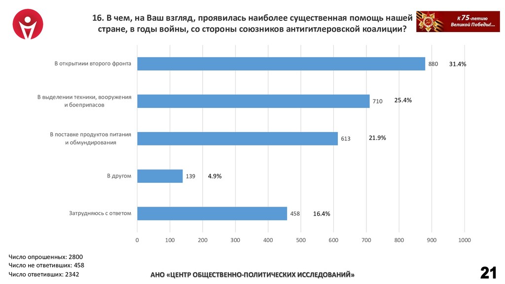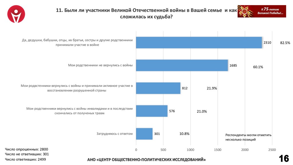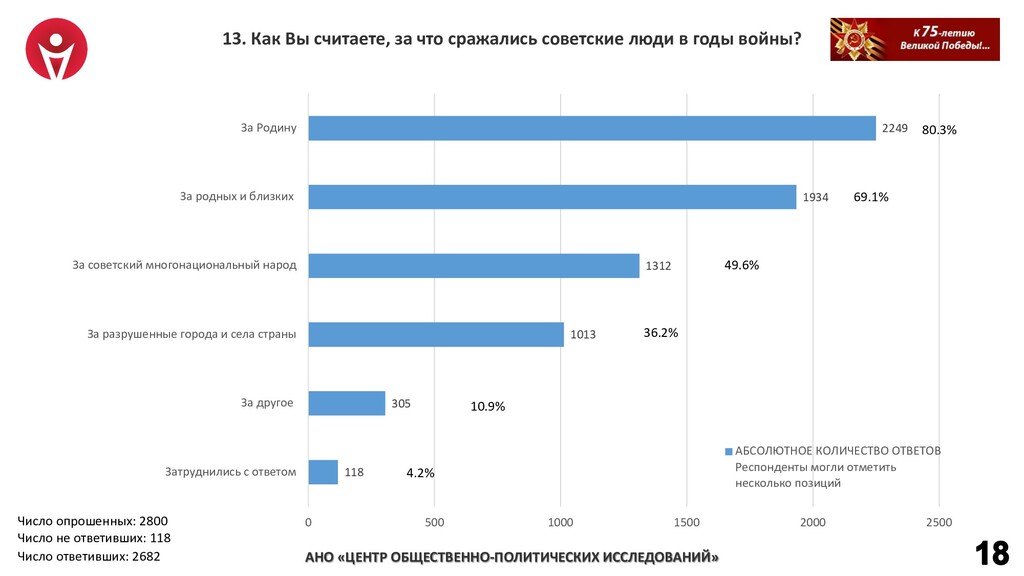 Обороны Российской Федерации, направленному на увековечение памяти погибших при защите Отечества? АНО «ЦЕНТР ОБЩЕСТВЕННО-ПОЛИТИЧЕСКИХ ИССЛЕДОВАНИЙ» Число опрошенных: 2800 Число не ответивших: 184 Число ответивших: 2616 184 416 1517 1423 1061 0 200 400 600 800 1000 1200 1400 1600 Затрудняюсь с ответом Проект, очевидно, не плохой но, ничего сказать не могу, так как впервые о нем слышу Положительно, этот проект по сути дела - строительство крупнейшего военно-исторического памятника Положительно. К строящемуся храму Вооруженных сил будет приложена дорога памяти, мемориал, увекавечивающий миллионы имен участников войны Положительно, так как наконец-то будет создана единая база данных о каждом участиве Великой Отечественнйо войны 37.9% 50.8% 54.2% 14.9% 6.6% Респонденты формулировали ответы сами и могли отметить несколько позиций