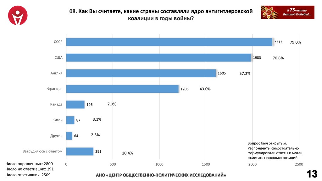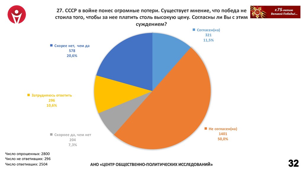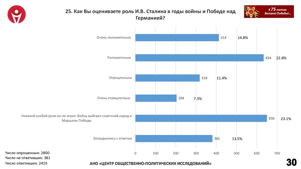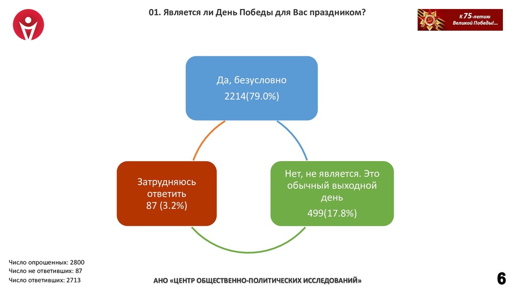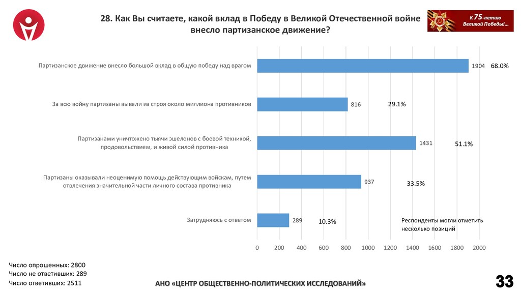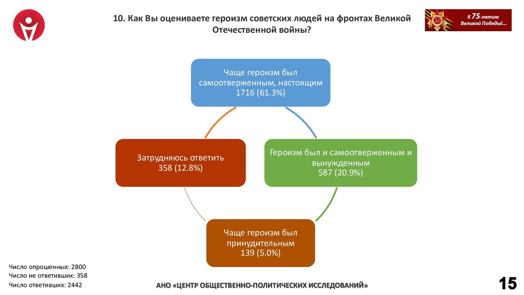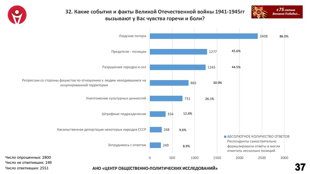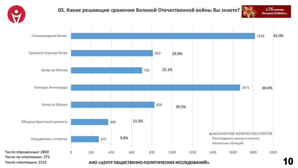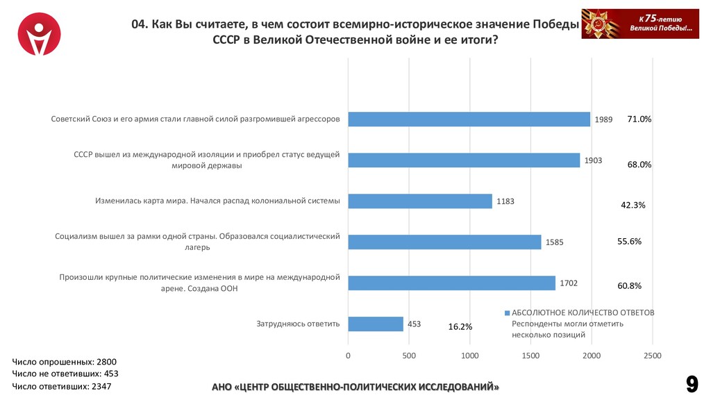 Обороны Российской Федерации, направленному на увековечение памяти погибших при защите Отечества? АНО «ЦЕНТР ОБЩЕСТВЕННО-ПОЛИТИЧЕСКИХ ИССЛЕДОВАНИЙ» Число опрошенных: 2800 Число не ответивших: 184 Число ответивших: 2616 184 416 1517 1423 1061 0 200 400 600 800 1000 1200 1400 1600 Затрудняюсь с ответом Проект, очевидно, не плохой но, ничего сказать не могу, так как впервые о нем слышу Положительно, этот проект по сути дела - строительство крупнейшего военно-исторического памятника Положительно. К строящемуся храму Вооруженных сил будет приложена дорога памяти, мемориал, увекавечивающий миллионы имен участников войны Положительно, так как наконец-то будет создана единая база данных о каждом участиве Великой Отечественнйо войны 37.9% 50.8% 54.2% 14.9% 6.6% Респонденты формулировали ответы сами и могли отметить несколько позиций