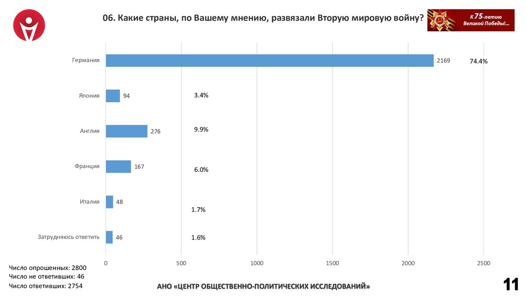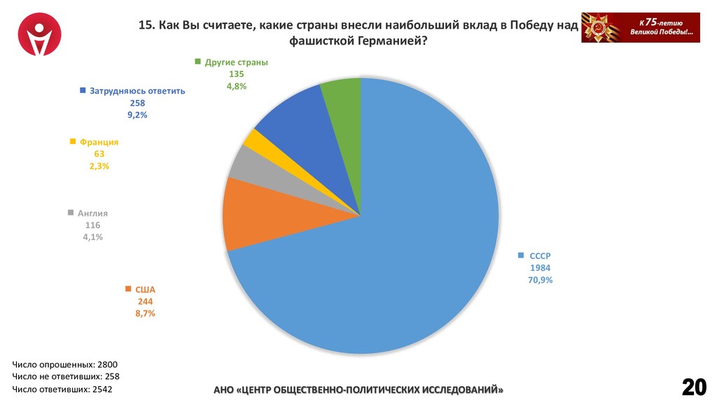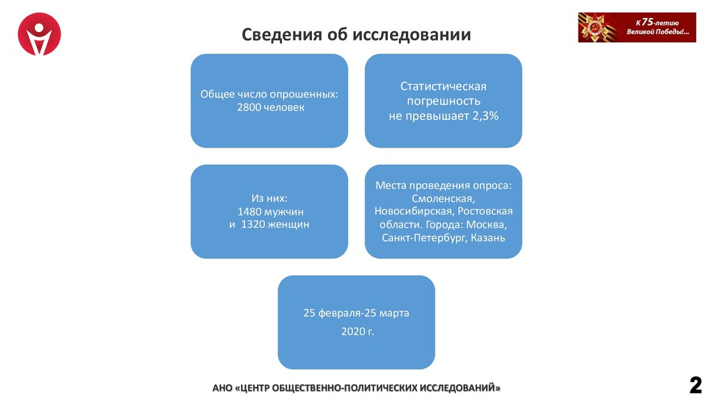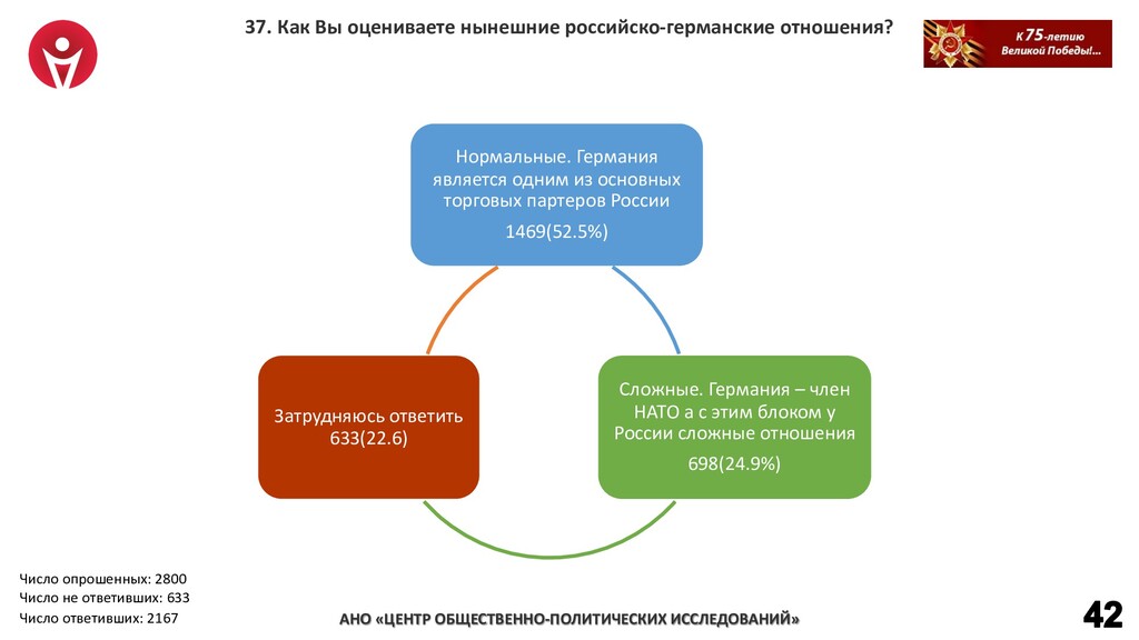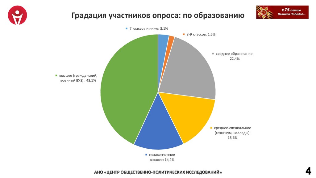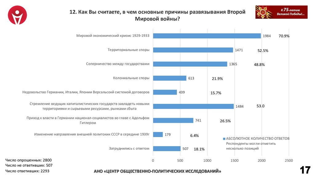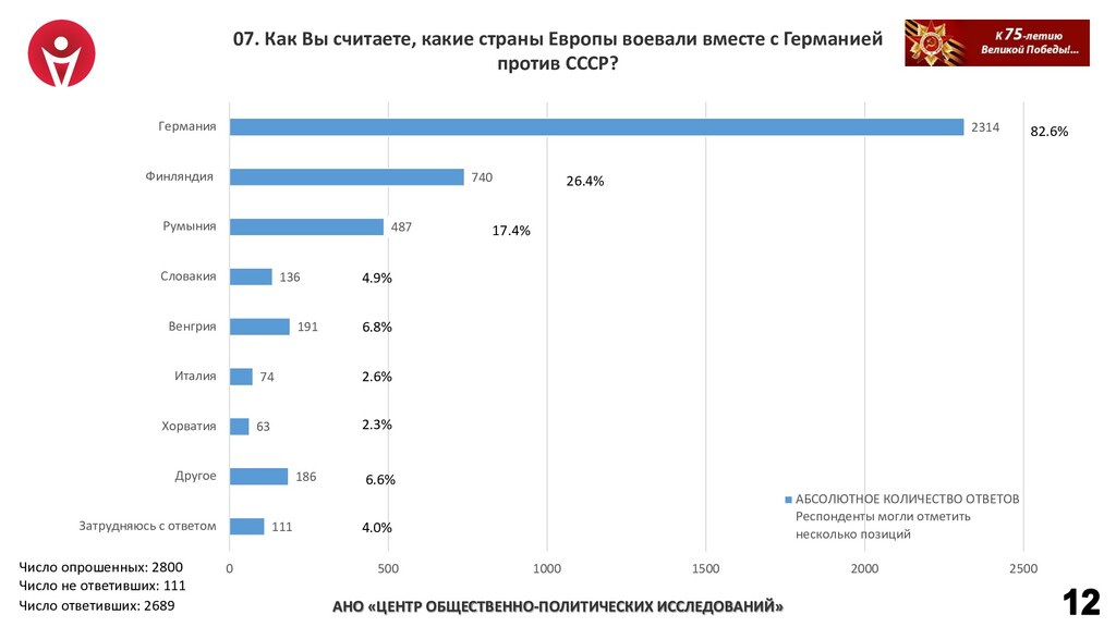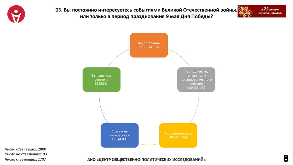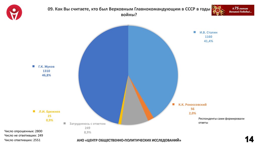 Обороны Российской Федерации, направленному на увековечение памяти погибших при защите Отечества? АНО «ЦЕНТР ОБЩЕСТВЕННО-ПОЛИТИЧЕСКИХ ИССЛЕДОВАНИЙ» Число опрошенных: 2800 Число не ответивших: 184 Число ответивших: 2616 184 416 1517 1423 1061 0 200 400 600 800 1000 1200 1400 1600 Затрудняюсь с ответом Проект, очевидно, не плохой но, ничего сказать не могу, так как впервые о нем слышу Положительно, этот проект по сути дела - строительство крупнейшего военно-исторического памятника Положительно. К строящемуся храму Вооруженных сил будет приложена дорога памяти, мемориал, увекавечивающий миллионы имен участников войны Положительно, так как наконец-то будет создана единая база данных о каждом участиве Великой Отечественнйо войны 37.9% 50.8% 54.2% 14.9% 6.6% Респонденты формулировали ответы сами и могли отметить несколько позиций