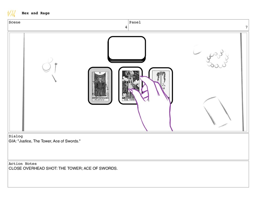 of Swords." Action Notes CLOSE OVERHEAD SHOT: THE TOWER; ACE OF SWORDS. Hex and Rage