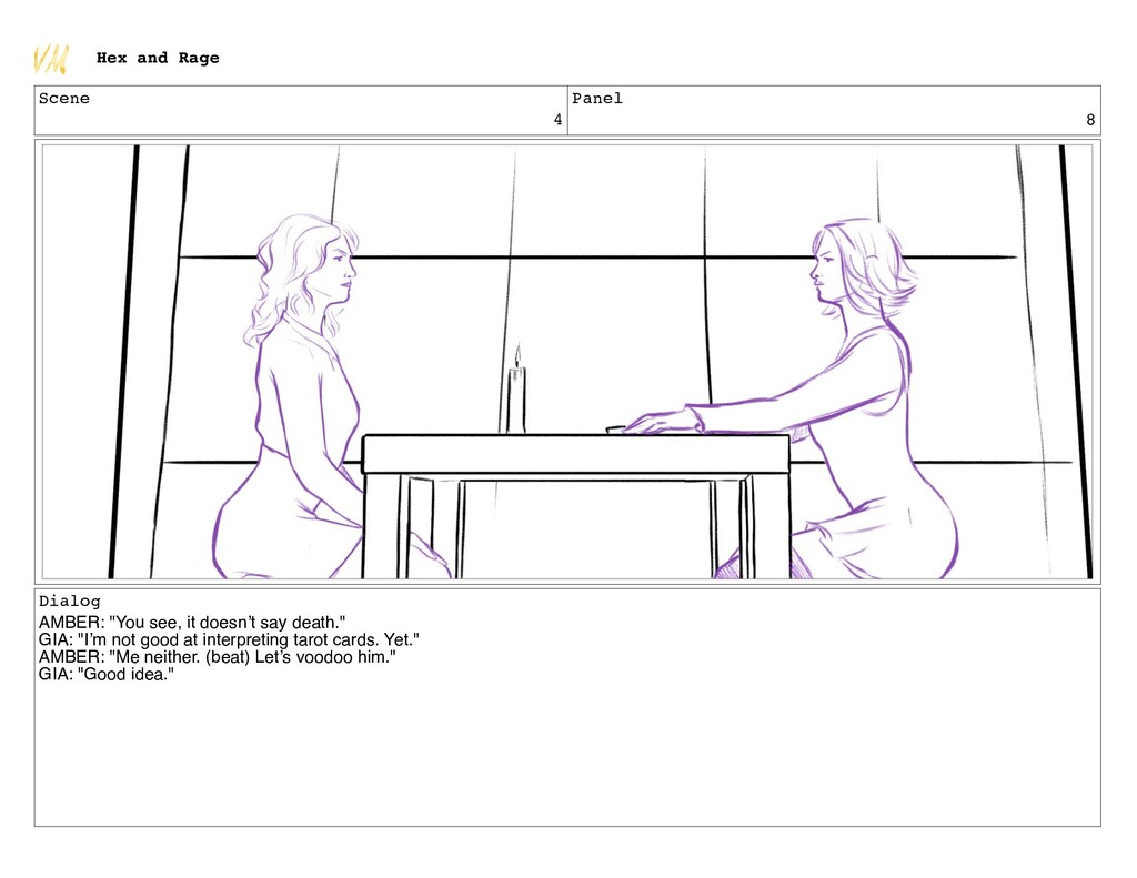 say death." GIA: "I’m not good at interpreting tarot cards. Yet." AMBER: "Me neither. (beat) Let’s voodoo him." GIA: "Good idea." Hex and Rage