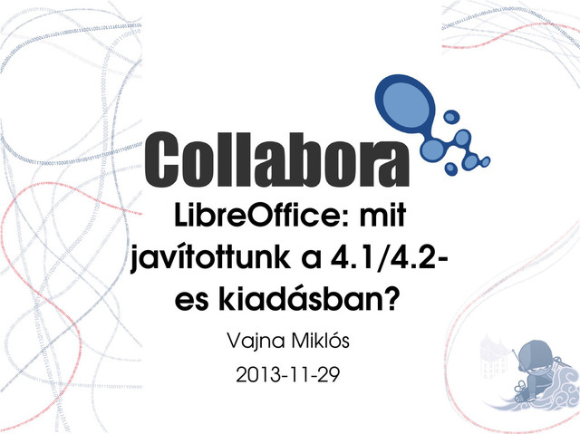 Miklós Köszönöm a figyelmet! • Konklúziók • 4.1 / 4.2 újdonságok: fejlődés, nem forradalom • A TDF (és a körülötte lévő cégek) anyagi helyzete miatt egyelőre nem kell aggódni • Izgalmas új fejlesztések • Kérdések? Diák: http://vmiklos.hu/odp