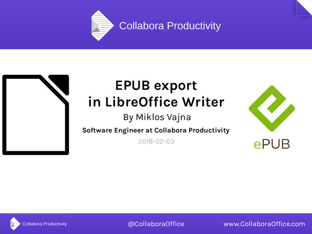 • EPUB is kind of the new PDF • Writer export ships in LibreOffice 6.0 • Converts Writer documents to ebooks • First librevenge-based export filter in LibreOffice • Thanks for listening! :-) • Slides: https://vmiklos.hu/odp/