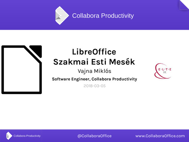Miklós Helyzet ma • Gerrit (review, git, CI) • freedesktop.org és GitHub mirrorok • CI: Linux x2, Windows, macOS • Hibajelentés: bugs.documentfoundation.org • Coverity, oss-fuzz • C++17/14/11 • Cppunit, ctags, cmake-compile-db, clang-format, stb. • Innen indulj: https://wiki.documentfoundation.org/Development