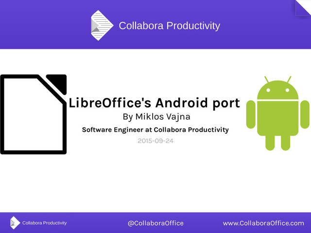 Summary • LibreOffice on Android is in progress since 2010 • Viewer now available in the Play store • Editing is an experimental feature • Sounds interesting? • Plenty of easy hacks around the document browser in the bugzilla • Thanks for listening! :-) • Slides: http://vmiklos.hu/odp