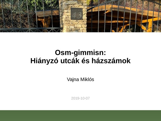 Miklós A megoldott probléma • Vegyünk publikusan elérhető magyar referencia házszám listákat (nincs koordináta): választási címjegyzék, govcenter • Hasonlítsuk össze, hogy szerepel-e mind az OSM-ben • Mindez egy könnyen elérhető weboldalon: https://vmiklos.pythonanywhere.com/osm/ • Naponta automatikusan frissítve