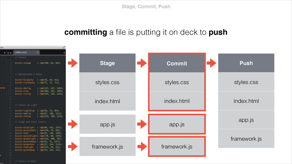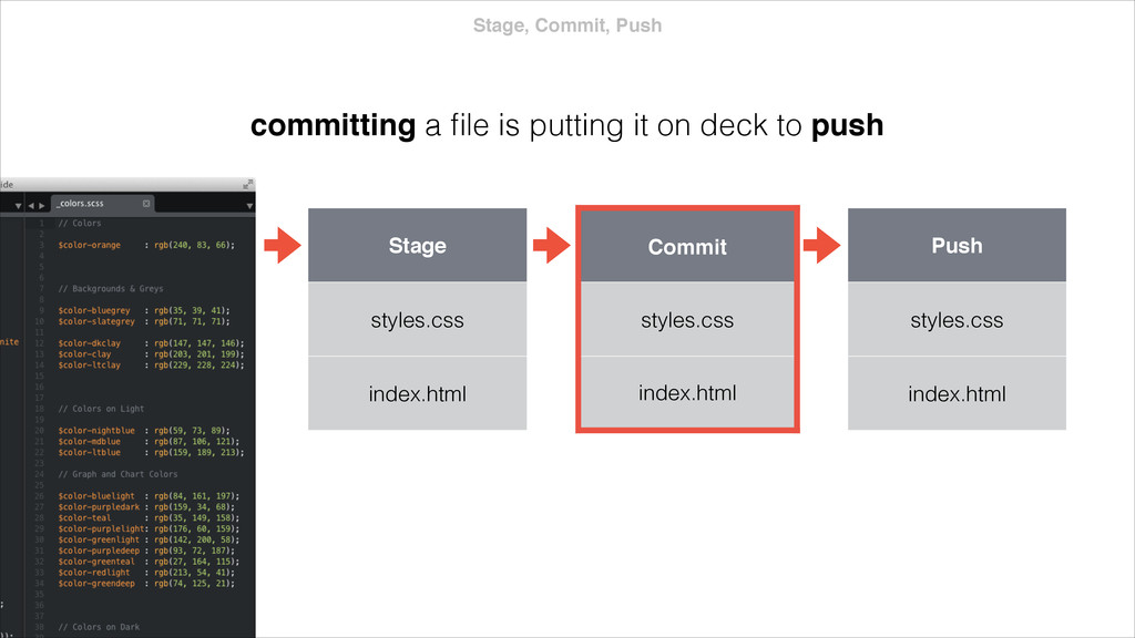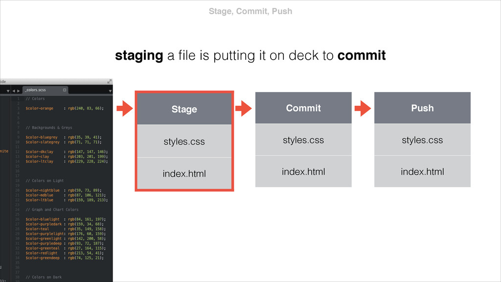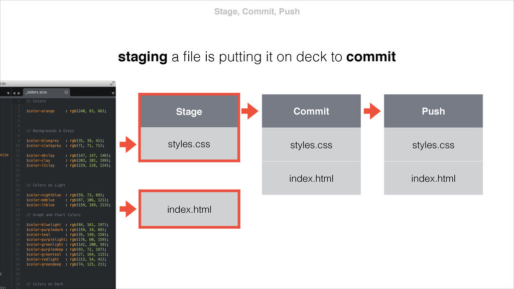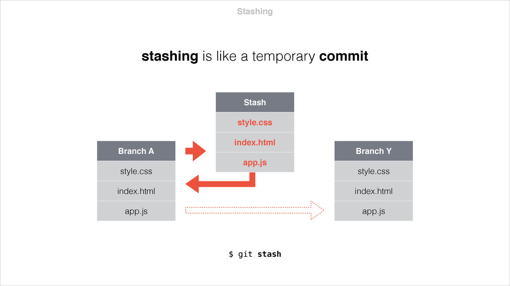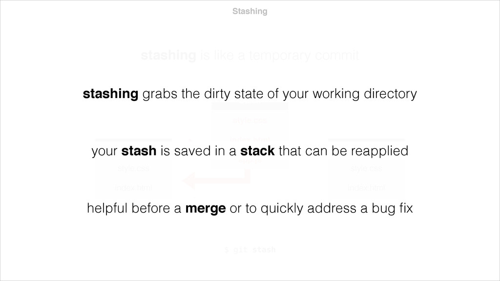 index.html app.js $ git stash Stash style.css index.html app.js Branch Y style.css index.html app.js stashing grabs the dirty state of your working directory your stash is saved in a stack that can be reapplied helpful before a merge or to quickly address a bug fix