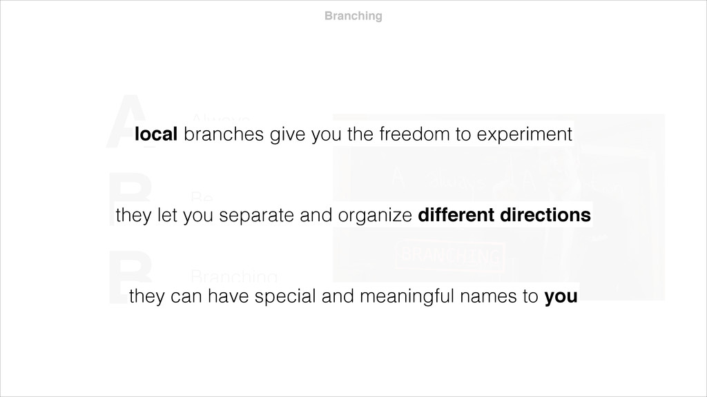 an existing local or remote branch $ git checkout -b my-new-branch create a new branch with the same command $ git branch -d my-unused-branch kill branches you don’t care about