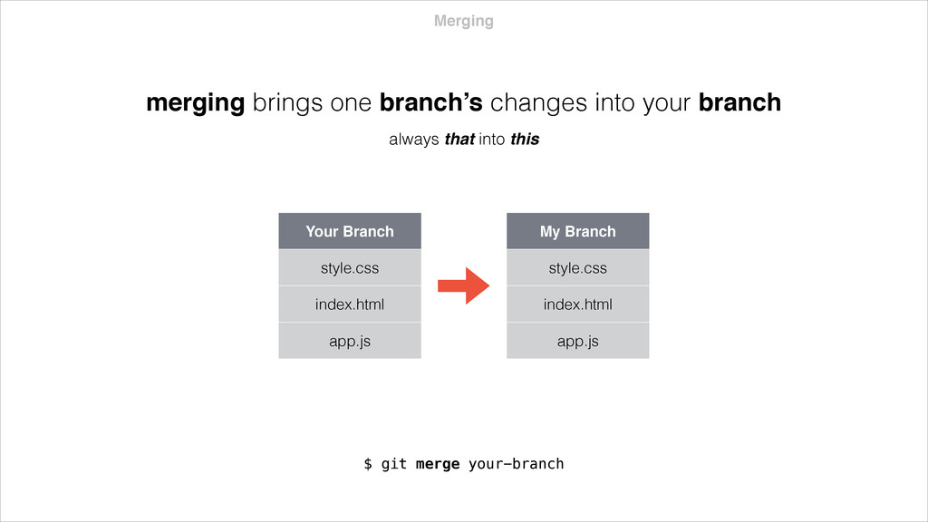 app.js My Branch* style.css index.html app.js CONFLICT merging brings one branch’s changes into your branch always that into this $ git merge your-branch