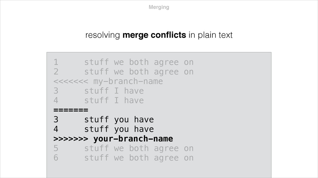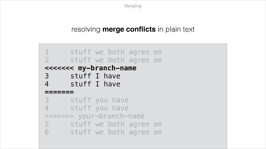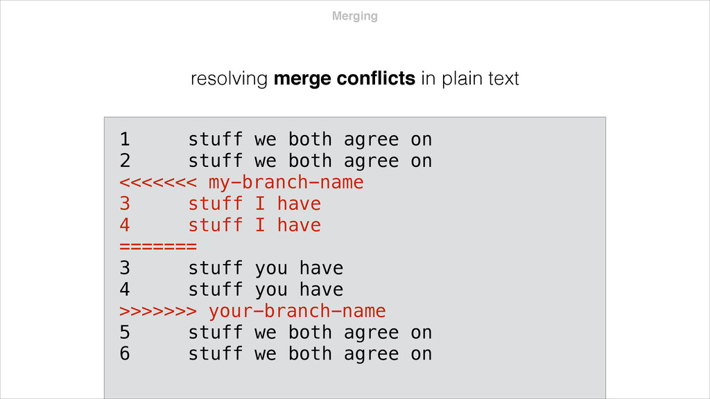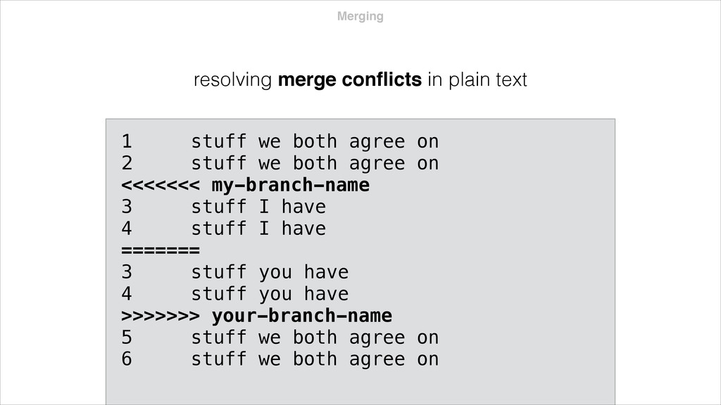 both agree on 2 stuff we both agree on <<<<<<< my-branch-name 3 stuff I have 4 stuff I have ======= 3 stuff you have 4 stuff you have >>>>>>> your-branch-name 5 stuff we both agree on 6 stuff we both agree on