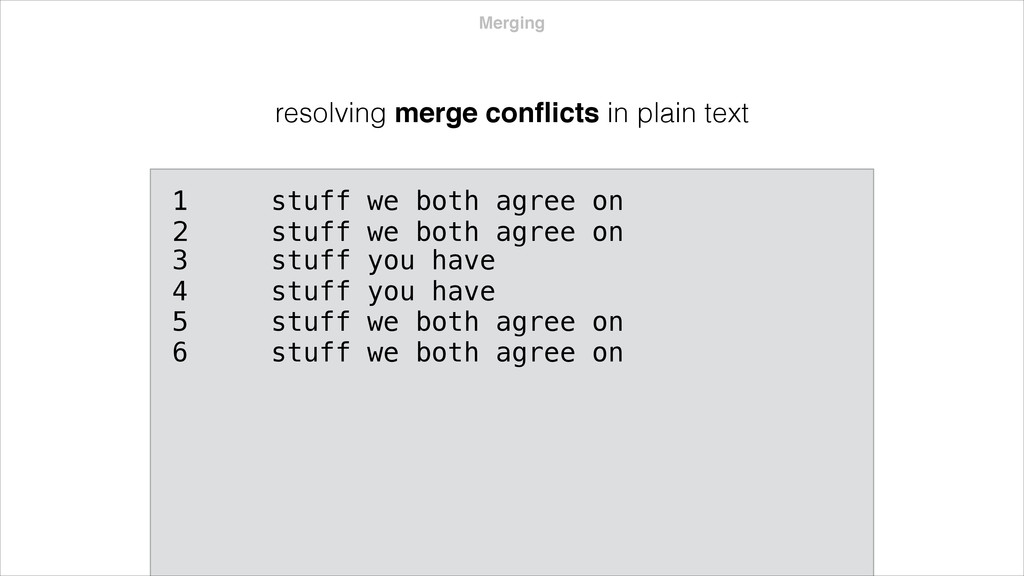 both agree on 2 stuff we both agree on <<<<<<< my-branch-name 3 stuff I have 4 stuff I have ======= 3 stuff you have 4 stuff you have 5 stuff we both agree on 6 stuff we both agree on >>>>>>> your-branch-name