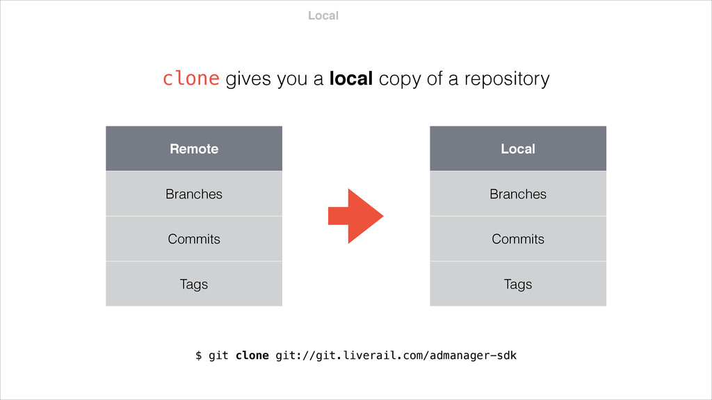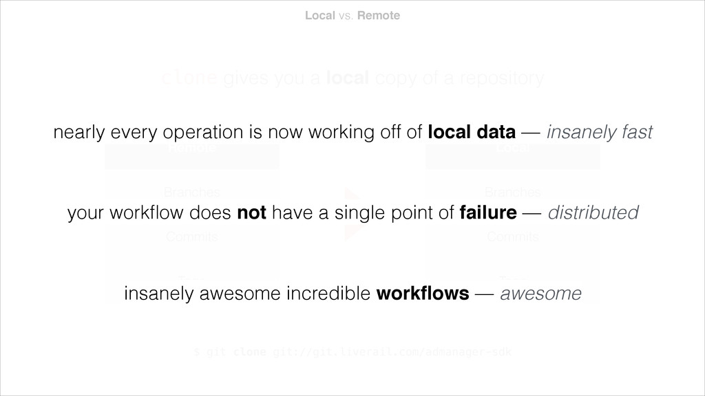 a repository Remote Branches Commits Tags Local Branches Commits Tags $ git clone git://git.liverail.com/admanager-sdk nearly every operation is now working off of local data — insanely fast your workflow does not have a single point of failure — distributed insanely awesome incredible workflows — awesome