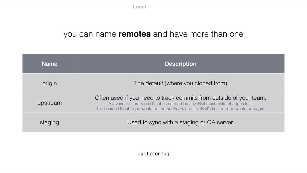 .git/config Name Description origin The default (where you cloned from) upstream Often used if you need to track commits from outside of your team. A javascript library on Github is needed but LiveRail must make changes to it. The source Github repo would be the upstream and LiveRail’s hosted repo would be origin. staging Used to sync with a staging or QA server.