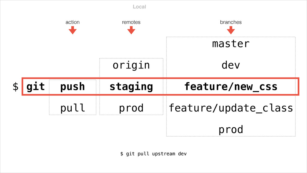 prod master you can push things from local to a remote $ git fetch upstream you can fetch a remote $ git pull origin master you can pull changes from a remote to local pull is fetch+merge