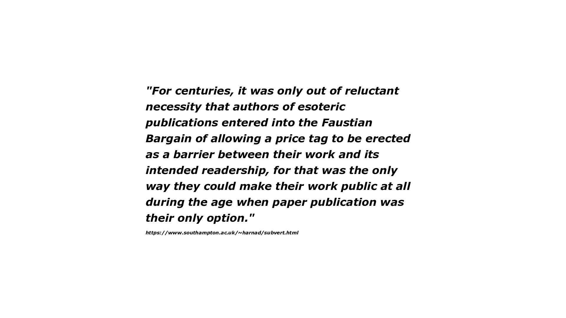 authors of esoteric publications entered into the Faustian Bargain of allowing a price tag to be erected as a barrier between their work and its intended readership, for that was the only way they could make their work public at all during the age when paper publication was their only option." https://www.southampton.ac.uk/~harnad/subvert.html